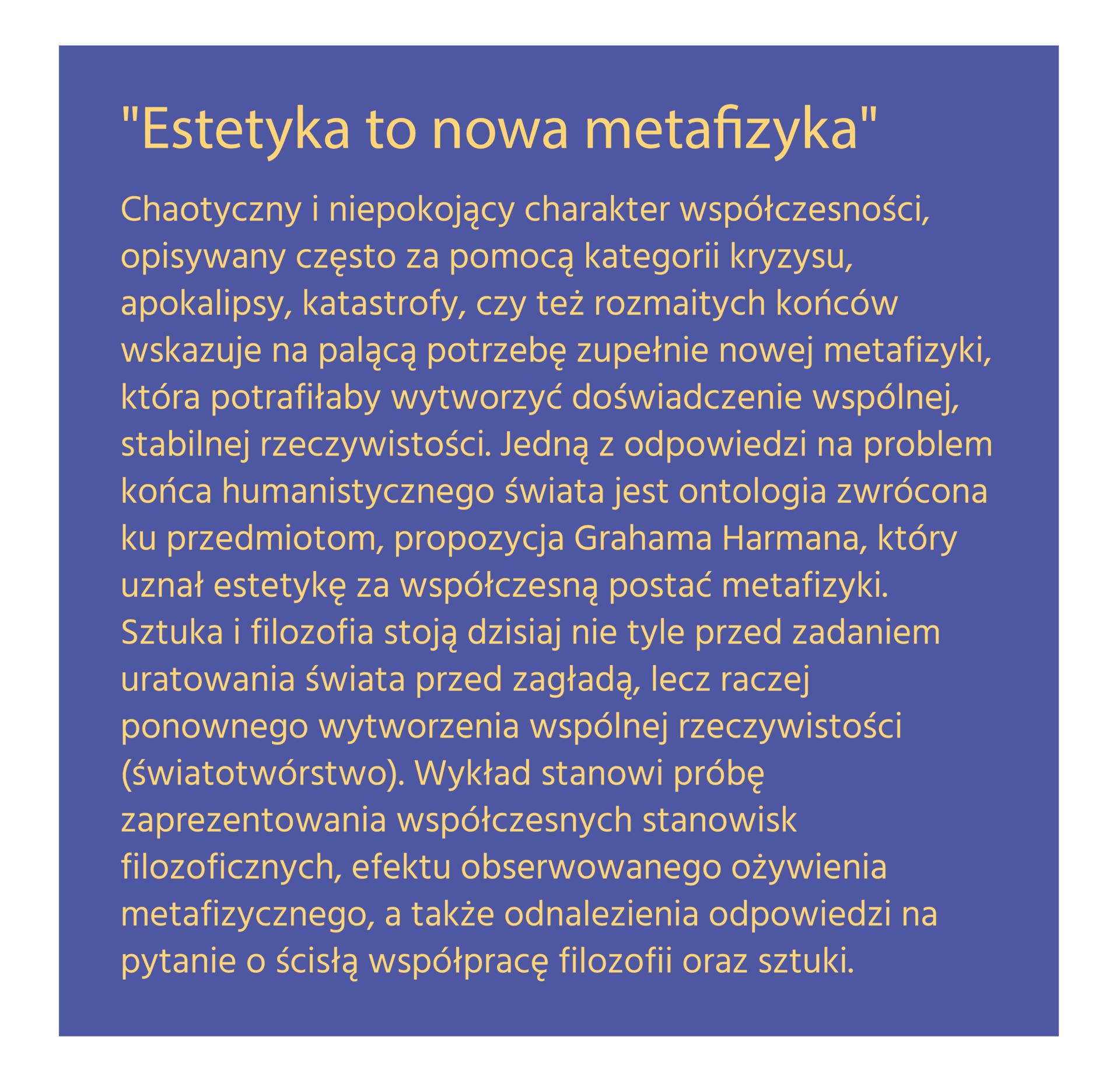Chaotyczny i niepokojący charakter współczesności, opisywany często za pomocą kategorii kryzysu, apokalipsy, katastrofy, czy też rozmaitych końców wskazuje na palącą potrzebę zupełnie nowej metafizyki, która potrafiłaby wytworzyć doświadczenie wspólnej, stabilnej rzeczywistości. Jedną z odpowiedzi na problem końca humanistycznego świata jest ontologia zwrócona ku przedmiotom, propozycja Grahama Harmana, który uznał estetykę za współczesną postać metafizyki. Sztuka i filozofia stoją dzisiaj nie tyle przed zadaniem uratowania świata przed zagładą, lecz raczej ponownego wytworzenia wspólnej rzeczywistości (światotwórstwo). Wykład stanowi próbę zaprezentowania współczesnych stanowisk filozoficznych, efektu obserwowanego ożywienia metafizycznego, a także odnalezienia odpowiedzi na pytanie o ścisłą współpracę filozofii oraz sztuki.