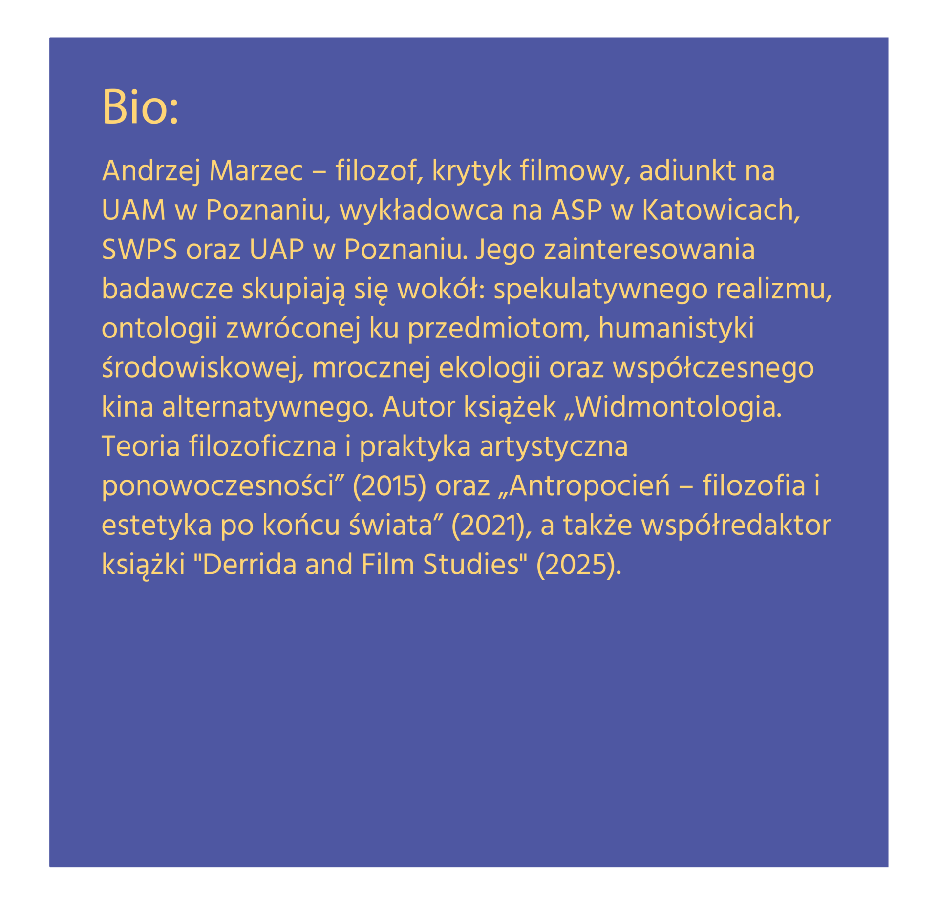 Wykład dr. Marca pod tytułem „Estetyka to nowa metafizyka” będzie okazją do wspólnej refleksji nad rolą estetyki we współczesnym myśleniu — nie tylko jako dziedziny sztuki, ale jako głębokiej percepcji świata, która może pełnić funkcję metafizycznego spojrzenia. Dr Marzec, filozof, krytyk filmowy i redaktor „Czasu Kultury”, często sięga po zagadnienia ontologii, spekulatywnego realizmu, teorie widm oraz idee związane z antropocenem. W swojej pracy łączy erudycyjne podejście z wrażliwością na praktyczne i artystyczne implikacje — co czyni jego wystąpienia szczególnie inspirującymi dla osób zajmujących się sztuką, teorią i refleksją estetyczną.
