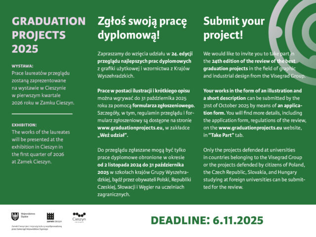 Rusza 24. edycja międzynarodowego przeglądu najlepszych prac dyplomowych z grafiki użytkowej i wzornictwa z Polski, Czech, Słowacji i Węgier, a także studentów z tych krajów studiujących na uczelniach zagranicznych. Do udziału w Graduation Projects zaprasza Zamek Cieszyn. Na zgłoszenia czekamy do 6 listopada.