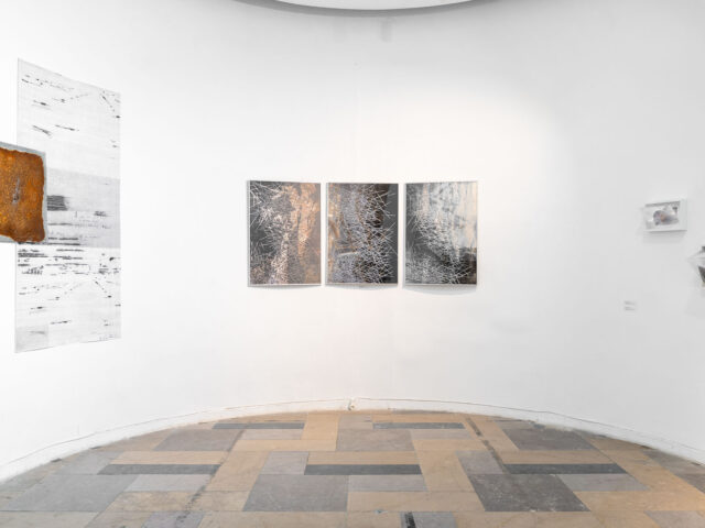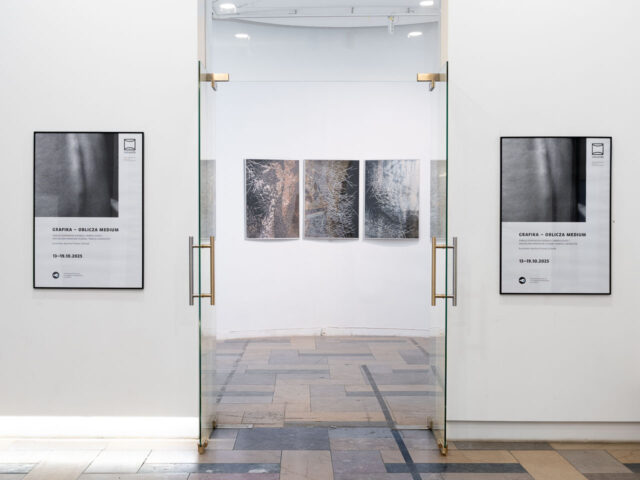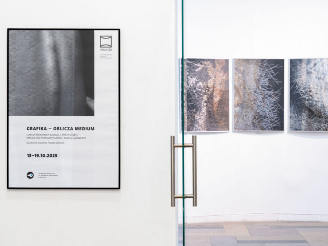 „GRAFIKA – OBLICZA MEDIUM” to ekspozycja prezentująca niekonwencjonalne podejścia do grafiki artystycznej w wykonaniu twórczyń młodego i średniego pokolenia, związanych z Uniwersytetem Artystycznym im. Magdaleny Abakanowicz w Poznaniu. Wystawa ukazuje szerokie spektrum eksperymentalnych praktyk twórczych, które z jednej strony redefiniują granice medium, z drugiej zaś – wchodzą ze sobą w zaskakujące, dialogiczne relacje. Izabela Idzikowska-Bzdręga, aluzyjnie ukazując motywy pejzażowe, łączy w swoich pracach technikę linorytu i druku cyfrowego, doprowadzając do konfrontacji tradycyjnych i niekonwencjonalnych rozwiązań graficznych. Z kolei Marta Chudy łączy tworzywa i praktyki tkaninowe z możliwościami serigrafii oraz przekazami dotyczącymi ciała, diagnozowania chorób i związanych z tym zapisów wizualnych Magdalena Parnasow-Kujawa kreuje natomiast niekonwencjonalne kompozycje, w których metalowe blachy kojarzące się z graficznymi matrycami oraz odpowiednio umiejscowione soczewki, odmieniają nasze stereotypowe mniemania na temat obrazu i jego przestrzennych, iluzyjnych czy przedmiotowych aspektów. Zaskakującym dialogiem z pracami Magdaleny Parnasow-Kujawy staje się tryptyk Kamili Lukaszczyk zatytułowany Koniki istnienia. Trzy pamięci. Artystka wykorzystuje w nim różnorodne techniki: sitodruk, druk reliefowy, druk cyfrowy UV oraz skorodowaną blachę. Zestawiając efemeryczne wizerunki piany i wody z fragmentarycznymi, nieczytelnymi zapisami tekstowymi, Lukaszczyk konstruuje refleksję nad przemijaniem, ulotnością i miejscem człowieka w świecie języka i kultury. Wystawa „GRAFIKA – OBLICZA MEDIUM” ma kameralny charakter, z założenia ukazuje fragmentaryczny wycinek współczesnych, niekonwencjonalnych poszukiwań twórczych oraz nie wytycza ściśle określonych ram tematycznych. Celowo staje się wydarzeniem otwartym, do którego można proponować kolejne części i odsłony ekspozycyjne.
