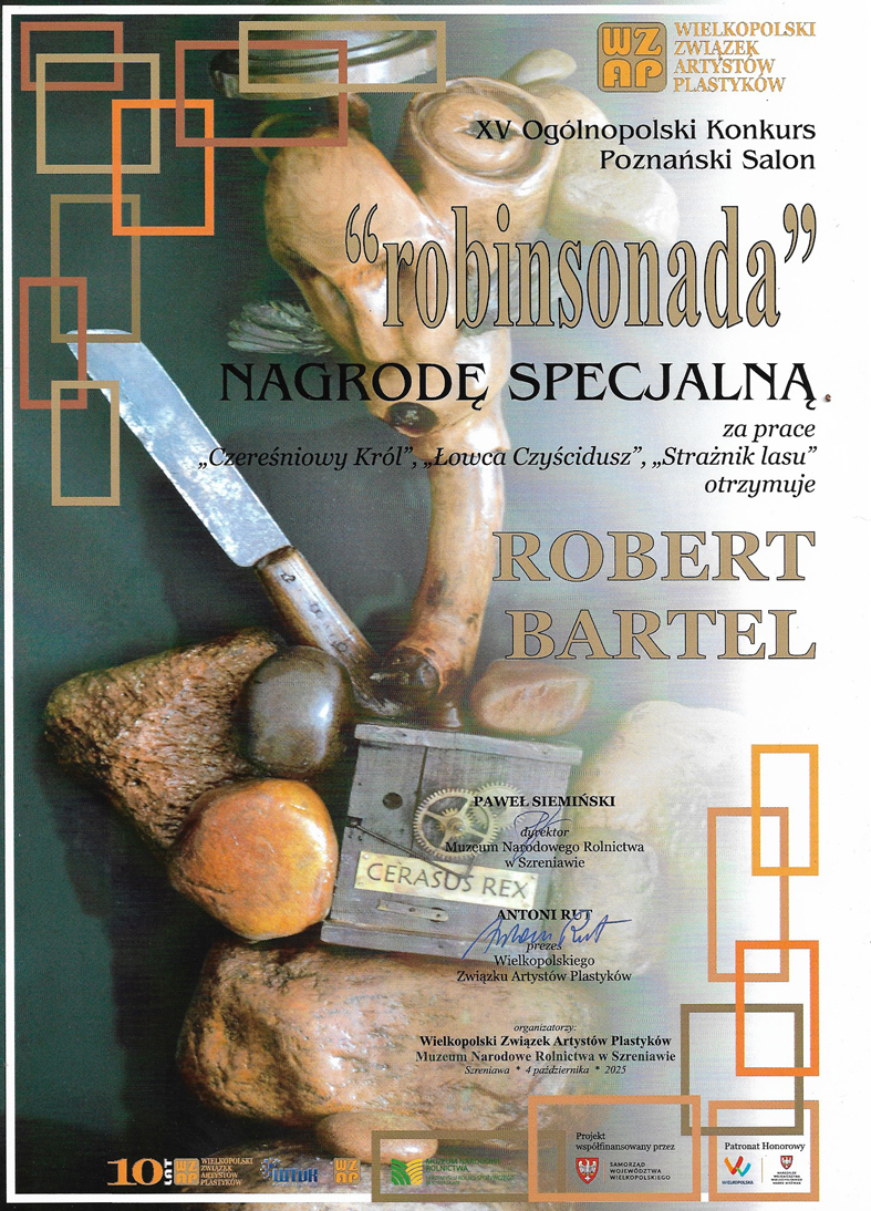 Z wielką przyjemnością informujemy, że prof. dr hab. Robert Bartel został uhonorowany Nagrodą Specjalną na XV Ogólnopolskim Konkursie Poznański Salon „Robinsonada” za prace: „Czereśniowy Król”, „Łowca Czyścidusz” i „Strażnik lasu”.