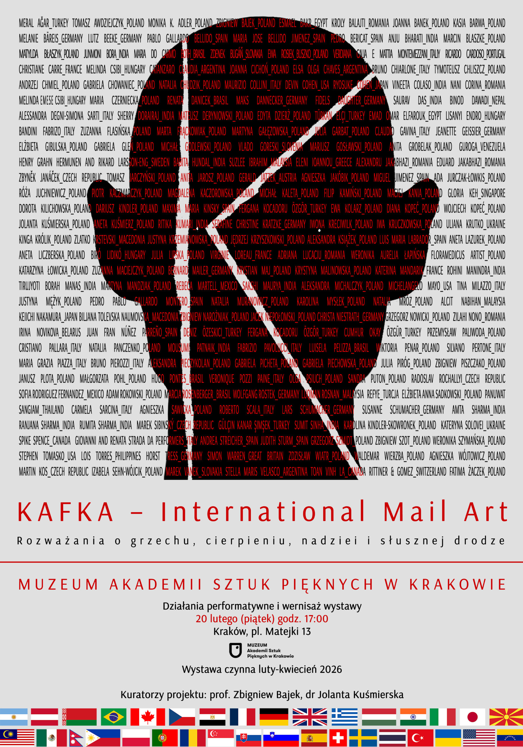 W 2024 r. przypadała setna rocznica śmierci Franza Kafki, jednego z najwybitniejszych twórców XX wieku. Wpływ Kafki na sztukę, nie tylko literaturę, jest nie do przecenienia. Dzieło Kafki inspiruje ludzi filmu, teatru, twórców z obszaru sztuk wizualnych. Fascynuje ich nie tylko głęboka znajomość ludzkiej psychiki zapisana w dziełach praskiego pisarza, ale także nieograniczona wyobraźnia, plastyczność jego wizji i forma – prosta a jakże nośna. Świat Kafki, to nieprzebrany zbiór wstrząsających i poruszających obrazów, bliskich i czytelnych tym, którzy obdarzeni podobną wrażliwością, zachwycają się fenomenem życia i przerażają nim. Akademia Sztuk Pięknych w Krakowie od kilkunastu lat organizuje przedsięwzięcia artystyczne, dla których inspirację stanowią aforyzmy Franza Kafki ze zbioru „Rozważania o grzechu, cierpieniu, nadziei i słusznej drodze”. Akcja realizowana przez kilkanaście miesięcy nie zakończy się wraz z zamknięciem wystawy. Jednym z ważnych aspektów projektu jest zobowiązanie złożone przez Muzeum Akademii Sztuk Pięknych w Krakowie do realizacji, w zgodzie z wszelkimi zasadami, zewidencjonowania i opracowania wszystkich nadesłanych prac, ujęcie ich w jeden zespół/tekę z nadanym konkretnym numerem inwentarzowym. Pozwoli to nie tylko na ich zabezpieczenie, ale także stworzenie świadectwa konkretnego działania odbywającego się w określonym czasie. Przekazanie Muzeum ASP prac oraz ich zabezpieczenie stanowić będzie wzbogacenie zbiorów, ale oprócz ewidentnego waloru artystycznego stanowić będzie interesujący zbiór muzealiów ilustrujący jeden ze sposobów działania artystów z całego świata, który był podjęty pod koniec pierwszej ćwierci dwudziestego pierwszego wieku.