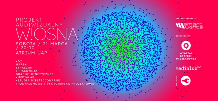 W!OSNA – projekt audiowizualny 21.03.2026 r., godz. 20:00Atrium UAP, bud. BGrafika Kinetyczna UAP W!OSNA – projekt audiowizualny który łączy animację graficzną i muzykę – wyświetlany na specjalnie przygotowanej instalacji LED (6000 diod) w kształcie koła o średnicy 7m. + DJMAREKSTRASZAK+ PRACOWNIAGRAFIKI KINETYCZNEJ+ MEDIALAB+ STUDIA NIESTACJONARNE+ PODYPLOMOWE + VFX (GRAFIKA PROJEKTOWA)