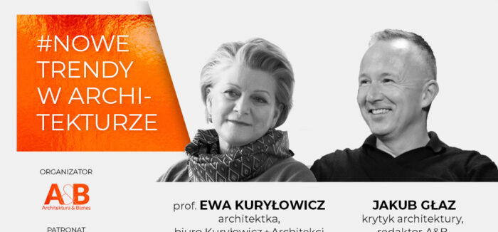 Spotkanie Live A&B z cyklu #NOWE TRENDY W ARCHITEKTURZE Jakie są nowe trendy w architekturze? Jaka jest w nim dziś rola architektury? Co jej twórcy powinni robić lub zmienić i po jakie narzędzia sięgnąć? Architektura & Biznes gości najlepszych twórców, architektów, projektantów, a rozmowy stają się przestrzenią wymiany opinii na temat współczesnych wyzwań i czerpania z projektowych doświadczeń. 18 grudnia (czwartek) o godzinie 13.00 odbędzie się kolejne spotkanie Live A&B z cyklu #NOWE TRENDY W ARCHITEKTURZE. Tym razem gościem będzie Ewa Kuryłowcz – wybitna postać polskiej architektury, laureatka Honorowej Nagrody SARP, profesor na Wydziale Architektury Politechniki Warszawskiej i autorka wielu nagradzanych projektów w kraju i za granicą, kieruje jedną z największych polskich pracowni, która od lat wyznacza trendy w architekturze — Kuryłowicz + Architekci. Spotkanie jest bezpłatne,