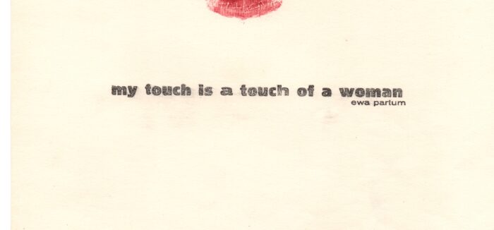 Artystyczna OBECNOŚĆ Ewy Partum Galeria Nowa Scena UAP, Al. Marcinkowskiego 2801-14.10.2025wernisaż: 09.10.2025, godz. 13:30 My Touch is a Touch of a Woman. To zdanie Ewa Partum umieściła na swojej pracy w 1971 roku. Obok pozostawiła odbicie czerwonych ust. Czerwona szminka to wyraźny ślad obecności kobiety. Obecności, która będzie charakteryzowała twórczość Partum przez kolejne pięćdziesiąt lat. Jej artystyczny dotyk to doświadczenie kobiety – uważne i krytyczne, osadzone w konkretnych realiach, zwracające uwagę na otaczający świat, powstającą sztukę i składane obietnice. Na prezentowanej wystawie ślad pocałunku może być również odczytany jako znak własności, pieczęć wskazująca na przejęcie ziemi. Dlatego obok tej pracy prezentujemy polską flagę wykonaną przez odbicia ust. Państwo naznaczone kobiecą obecnością. Te dwie prace zakreślają ramy całej prezentacji, w której