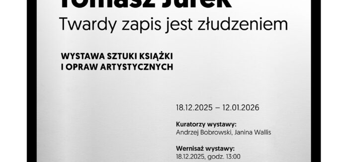 Tomasz Jurek | Twardy zapis jest złudzeniem Wernisaż: 18.12.2025, godz. 13:00Galeria Biblioteki Uniwersytetu Zielonogórskiego im. Jana BerdyszakaAl. Wojska Polskiego 71, Zielona Góra18.12.2025 – 12.01.2026Kuratorzy wystawy: Andrzej Bobrowski, Janina Wallis W świecie, w którym „społeczeństwo jako całość staje się strukturą coraz bardziej złożoną, ciągłą i spoistą, która rosnąc jak galaktyka we wszystkich kierunkach naraz, równocześnie zagęszcza się od wewnątrz”,1, coraz mniej oczywista staje się wiara w stabilność raz utrwalonych treści. Druk – rozumiany jako „twardy zapis” – coraz częściej okazuje się złudzeniem. W realiach nieustannie zmieniających się relacji społecznych i przepływów informacji żadna forma zapisu nie pozostaje stabilna – znaczenia ulegają przesunięciom, a to, co wydaje się utrwalone, podlega kolejnym reinterpretacjom. Książka jako materialna forma utrwalania idei, nie jest zamkniętym nośnikiem