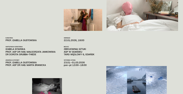 POŁĄCZONE PRZYPADKI Wystawa Pracowni Filmu Eksperymentalnego I,prof. Izabella Gustowska, mgr Izabela Sitarska,Uniwersytet Artystyczny w Poznaniu im. Magdaleny Abakanowicz Zbrojownia Sztuki Akademii Sztuk Pięknych w Gdańskuotwarcie wystawy: 22.01.2026 o godzinie 18.00wystawa czynna: 23.01- 01.03 2026kuratorka wystawy: prof. Izabella Gustowskawspółpraca kuratorska: Izabela Sitarska, prof. ASP dr hab. Małgorzata Jankowska, dr Dorota Grubbaaranżacja wystawy: prof. Izabella Gustowska, prof. ASP dr hab. Marta Branicka Udział biorą: Roch Adamczak, Iga Brzozowska, Zuzanna Czarczyńska, Sabina Gryczan, Dominika Hoyle, Anka Jaworska, Katsiaryna Kardash, Blanka Kęstowicz, Hanna Klewiado, Wiktor Krajcer, Zofia Kulesza, Lena Lubińska, Julia Mendyk, Adrianna Metryka, Tymon Modrzyński, Antoni Możdżeń, Izabela Nykiel, Olga Ormańczyk, Kasia Piątkowska, Malwina Postaremczak, Laura Radzewicz, Kaja Róg, Aleksandra Szalińska, Andrzej Staniek, Bona Stanulewicz, Bartek Walczak, Inga Wachowska, Julianna Warywoda, Hugo Woźniak,