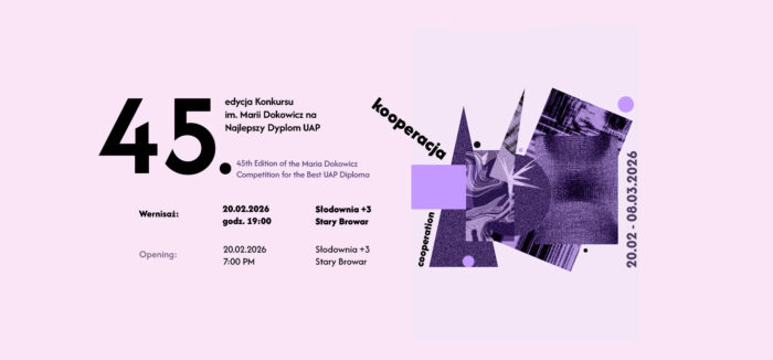 Rektor i Senat Uniwersytetu Artystycznego im. Magdaleny Abakanowicz w Poznaniu mają zaszczyt zaprosić na wernisaż wystawy oraz uroczyste wręczenie nagród podczas 45. edycji Konkursu im. Marii Dokowicz na Najlepszy Dyplom UAP pt. „Kooperacja”. Wstęp Miejsce:Słodownia Stary Browar ul. Półwiejska 42, 61–888 Poznań Wernisaż:20.02.2026 (piątek), godz. 19:00Słodownia +3, Stary Browar ul. PółwiejskaFebruary 20th, 7 p.m. Wystawa:20.02–08.03.2026 Organizacja:Uniwersytet Artystyczny im. Magdaleny Abakanowicz w Poznaniu, Fundacja Nowa Uniwersytetu Artystycznego w Poznaniu, Miejskie Galerie UAP Partnerzy:Miasto Poznań, Galeria Miejska Arsenał, Stary Browar Patronat honorowy:Minister Kultury i Dziedzictwa Narodowego Kurator:Maciej Kurak Identyfikacja wizualna wystawy:Kamila Lukaszczyk Koordynacja:Yuliya Zalozna Koordynacja, projekt zabudowy i aranżacja:Rafał Rzadkiewicz, Jarek Jasik Kierownictwo produkcji:Piotr Grzywacz Zespół organizacyjny:Michał Jaborski, Jarek Jasik, Matylda Konarska, Agnieszka Krupa, Olena Petrenko, Yuliya Zalozna, Viktoria Zalozna Zespół techniczny:Damian