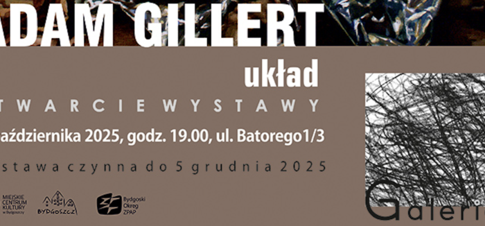 Adam Gillert | Układ Otwarcie wystawy: 23.10.2025 godz. 19:00Wystawa potrwa do 05.12.2025Galeria Wspólna MCK w Bydgoszczy Nic nie jest takie, jak się Państwu zdaje; gruszka jest gruszką, ale z pewnego dystansu staje się cesarskim nosem… Granice są płynne, a zmysły zawodne. — Luigi Pirandello Na pierwszy rzut oka widzimy stos ubrań. Może to rzeczy do prania, może bezceremonialnie zrzucone po powrocie do domu. Z centrum tej sterty bije biel jakiejś koszuli, pełna szarawych cieni, które modelują każde zagięcie. Na samym dole chłodny ciemnoniebieski element, nieco przez resztę przysłonięty. Po lewej czerwień układa się w głębokie, płomienne fałdy, nad nią ciemna zieleń aksamitnej materii. Po prawej wzorzysta tkanina w orientalne, pomarańczowo-niebieskie desenie i znów mały fragment czerwieni. Nad nimi, na dodanym