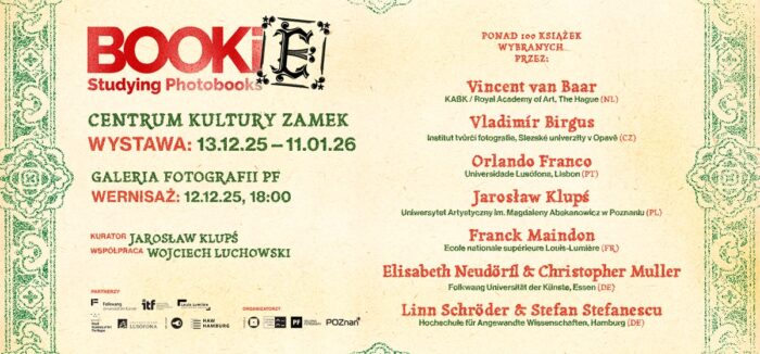 Zapraszamy na otwarcie międzynarodowego przeglądu książek fotograficznych zrealizowanych przez studentów i absolwentów uczelni artystycznych. Wystawa „BOOKie. Studying Photobooks” to prezentacja najnowszych, unikatowych książek fotograficznych. Jej celem jest promocja niszowych, wartościowych, autorskich „fotobuków”, stworzonych przez młodych artystów(-ki) z czołowych uczelni artystycznych. Pokazuje niekomercyjne, niskonakładowe publikacje, ziny i eksperymenty wydawnicze. kurator: Jarosław Klupśwspółorganizacja: Wydział Fotografii Uniwersytetu Artystycznego im. Magdaleny Abakanowicz w Poznaniu miejsce: Centrum Kultury ZAMEK, Galeria Fotografii pf (I piętro) wstęp wolny wystawa czynna: 13.12.2025−11.01.2026, wt.-nd. | g. 12-19 uczestnicy i uczestniczki: Josselin Apertet, Beatriz Banha, Elisa Bapst, Diogo Bento, Daria Bielenkov, Lena Blaschta, Enrico Carpi, Jasmin Cathor, Astrid Cheval, Monika Cyprian, Isabel Dantas dos Reis, An Debie, Leon Düllberg, Henrik Edlund, Salome Erni, Maximilian Cyrill Esters, Mariusz Forecki, Anthea Friebe, Masha Galling, Milo Garcia, Iwona Germanek, Arkadiusz Gola, Martin Gobert, Leila Graindorge, Teresa Halbreiter & Antonia Lohse, Nora Handsley, Elisa Heinrichs, Oliver Heise, Lillian Heliot, Marie Lise Hofstetter, Thomas Hunter, Kageaki Inoue, Mateusz Janik, Wiktor