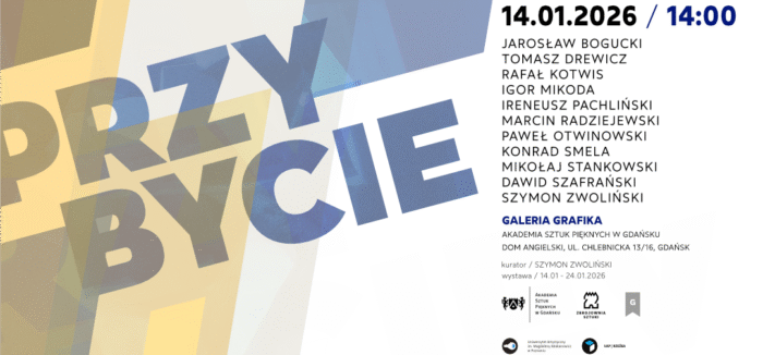 PRZY – BYCIE Wernisaż: 14.01.2026, godz. 14:00Miejsce: GALERIA GRAFIKA,Akademia Sztuk Pięknych W Gdańsku,Dom Angielski, ul. Chlebnicka 13/16, GdańskCzas trwania wystawy: 14 – 24.01.2026 r. Artyści: Jarosław Bogucki, Tomasz Drewicz, Rafał Kotwis, Igor Mikoda, Ireneusz Pachliński, Marcin Radziejewski, Paweł Otwinowski, Konrad Smela, Mikołaj Stankowski, Dawid Szafrański, Szymon Zwoliński. Po niedawnym spotkaniu z twórczością pedagogów i artystów związanych z Akademią Sztuk Pięknych w Gdańsku, przychodzi moment odpowiedzi. Jako przedstawiciele Uniwersytetu Artystycznego im. Magdaleny Abakanowicz w Poznaniu podejmujemy dialog poprzez sztukę – prezentując prace, które są zapisem obecności, relacji i wspólnego doświadczenia. Wystawa PRZY-BYCIE staje się przestrzenią spotkania: między uczelniami, środowiskami i indywidualnymi postawami twórczymi. To próba zatrzymania chwili bycia „obok” i „wobec” – w procesie, w obrazie, w materii – oraz zaproszenie