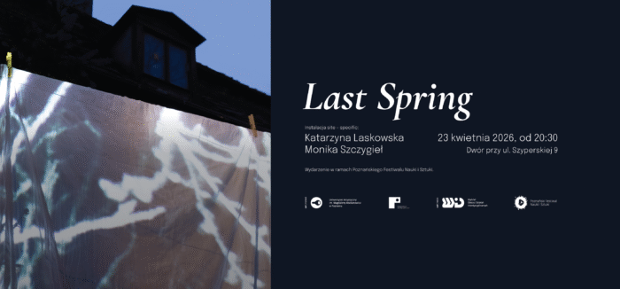 LAST SPRING Katarzyna LaskowskaMonika Szczygieł23.04.2026. godz. 20.30ul. Szyperska 9 „Last Spring” to instalacja site – specific w miejscu dzieciństwa i młodości Pani Marii, jej rodziny oraz kolejnych rodzin, pracowników Starej Papierni, a wcześniej Fabryki Ksiąg Handlowych, Kopert i Kajetów Edwarda Kręglewskiego. Obecnie zachowany ogród przed dworem jest jedynie niewielką częścią dawnego ogrodu z XVIII wieku. Projekt „Last Spring” jest instalacją z lekkich tkanin w formie ubrań rozwieszonych między drzewami, połączona z projekcją animacji opartych o zbiór archiwalnych fotografii. Zdjęcia wykorzystane w projekcie pochodzą z różnych źródeł, w tym z albumów rodzinnych autorek projektu. Obrazy wykorzystane do stworzenia animacji odnoszą się do uniwersalnego doświadczenia dzieciństwa, zapamiętanego jako ciąg rozmytych wspomnień i fragmentów obrazów natury, bliskich i domu, które zapisane głęboko w pamięci przywołują zarówno pierwotną fascynację światem, jak również lęk i niezrozumienie otaczającej rzeczywistości. Ingerencja w tkankę starego ogrodu jest także przypomnieniem czasów, kiedy dom i jego otoczenie żyły wraz z ich mieszkańcami, a w ogrodzie suszyło się pranie i bawiły się dzieci. Zapraszamy do wspólnego doświadczania poetyckiej opowieści o tym miejscu – na co dzień niedostępnym i zapomnianym. Nasza instalacja ma na celu uchwycenie niepowtarzalnego klimatu dworu zanim teren wraz z ogrodem zostaną poddane renowacji i przekształcone w budynki o zupełnie innym przeznaczeniu. Uczestnicy obserwują zza płotu i ze schodów w lewej części ogrodu, bez możliwości wejścia na teren (ze względów bezpieczeństwa). Wydarzenie odbędzie się w ramach Poznańskiego Festiwalu Nauki i Sztuki https://festiwal.amu.edu.pl/