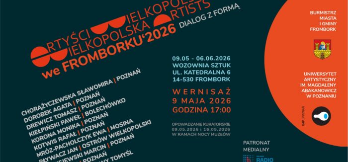 ARTYŚCI WIELKOPOLSKI | WIELKOPOLSKA ARTISTS we FROMBORKU’2026Galeria Wozownia Sztuk, ul. Katedralna 6. Fromborkwernisaż: 9.05.2026, godz. 17.0009.05-06.06.2026 Oprowadzanie kuratorskie: 9.05.2026 i 16.05.2026 Wystawę Projektu ARTYŚCI WIELKOPOLSKI | WIELKOPOLSKA ARTISTS pod tytułem ”ARTYŚCI WIELKOPOLSKI | WIELKOPOLSKA ARTISTS we FROMBORKU’2026” – realizowaną pod hasłem ”DIALOG Z FORMĄ” tworzy 11 zaproszonych do Projektu artystów związanych z Wielkopolską. Reprezentują oni różne środowiska i odmienne postawy twórcze. Każdy prezentuje też inne podejście do kwestii dialogu z formą. Dialog z formą w sztukach pięknych to zarówno proces twórczy jak i interpretacyjny polegający na bezustannej wymianie znaczeń. To konfrontacja artysty z materią oraz interakcja pomiędzy dziełem, a odbiorcą. Jest to pojęcie wielowymiarowe, łączące tradycyjne rzemiosło z nowymi mediami oraz teorią sztuki. W takim rozumieniu, dialog to często praca