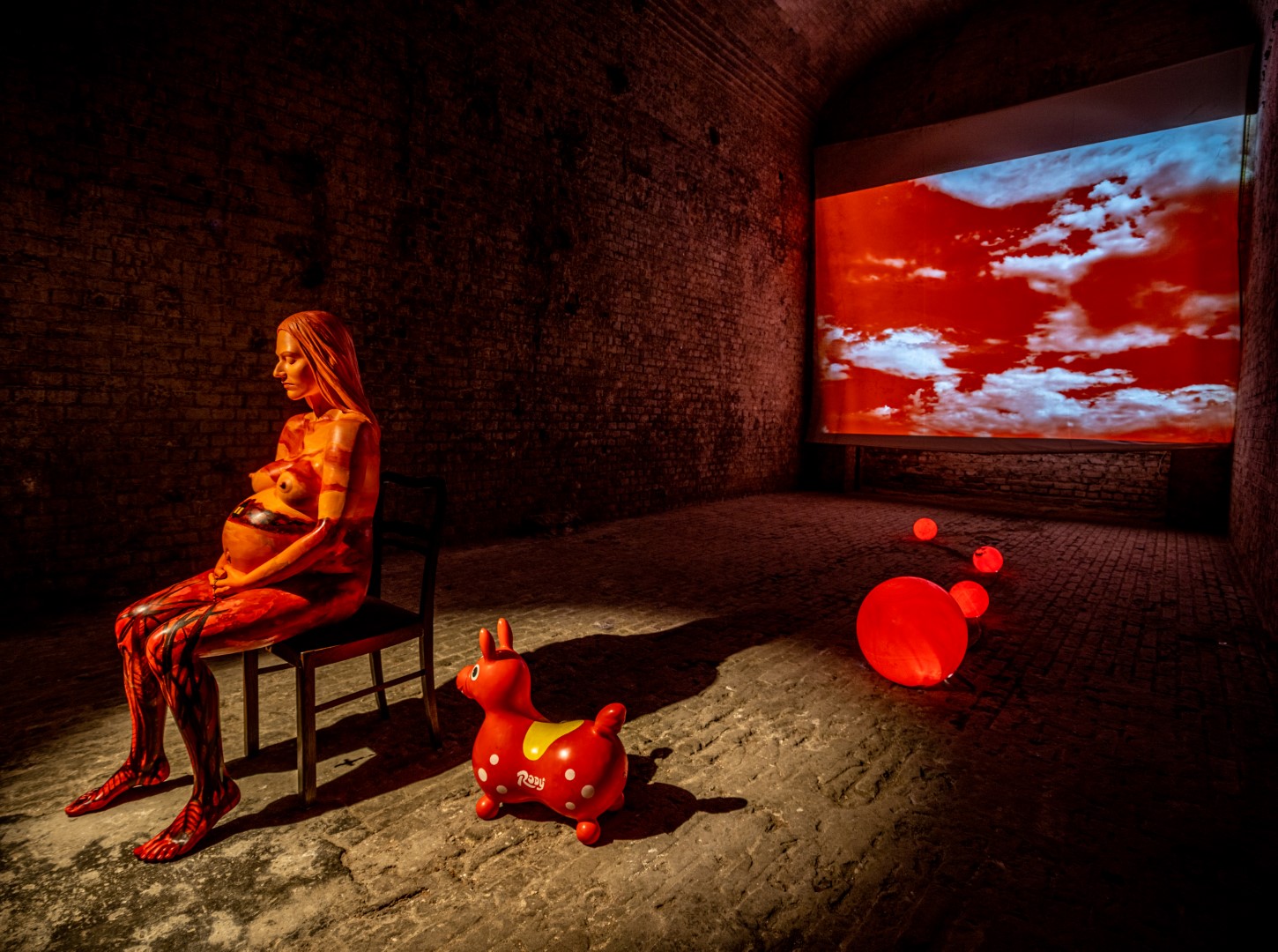 wieloelementowa instalacja: rzeźba z żywicy poliestrowej pokryta malarstwem figuratywnym, obiekty ready-made, projekcja wideo z dźwiękiem