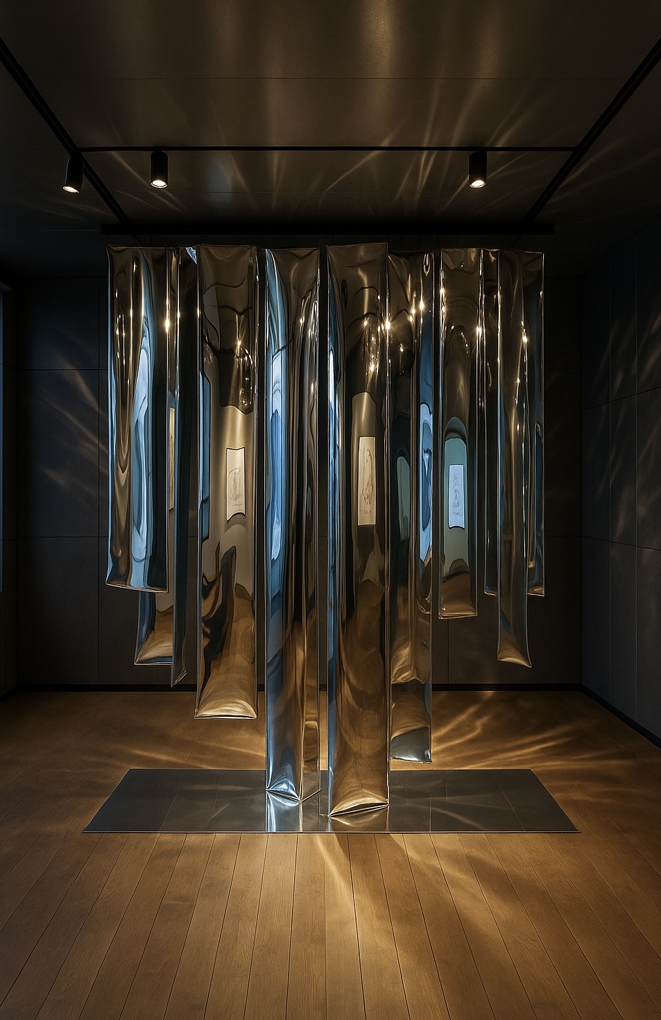 forma przestrzenna (folia lustrzana + stalowa konstrukcja, dł. 240 cm, głęb. 70 cm, wys. 250 cm)