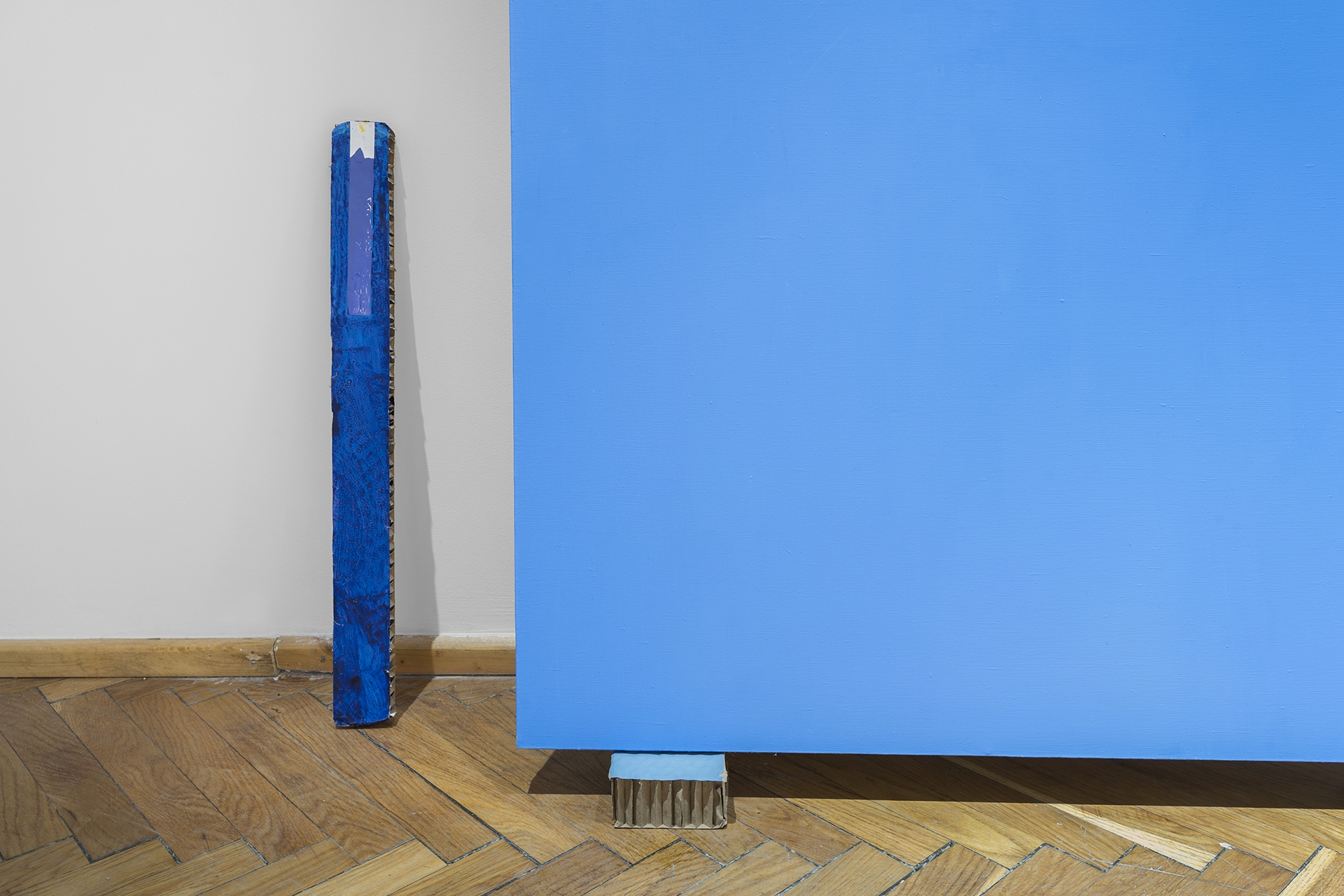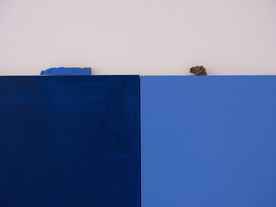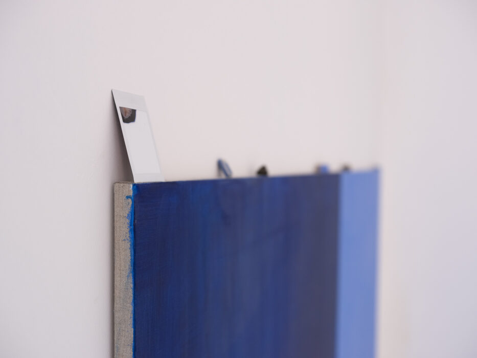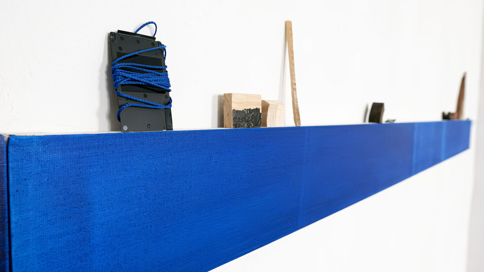 akryl na płótnie, 15 x 400 cm, obiekty: LIFE-LINA 2, połączone liny, UTRZYMUJĄC RÓWNOWAGĘ, deska, kamienie, GŁĘBIA, instalacja malarska, z cyklu ĆWICZENIA Z NAWIGACJI, akryl na płótnie + lina, 40x40cm / prace zaprezentowane premierowo na wystawie pt. (NIE)WIDOCZNE WYSPY, kuratorka: B. Błażewicz / Galerie Hafemann w Wiesbaden (2025)