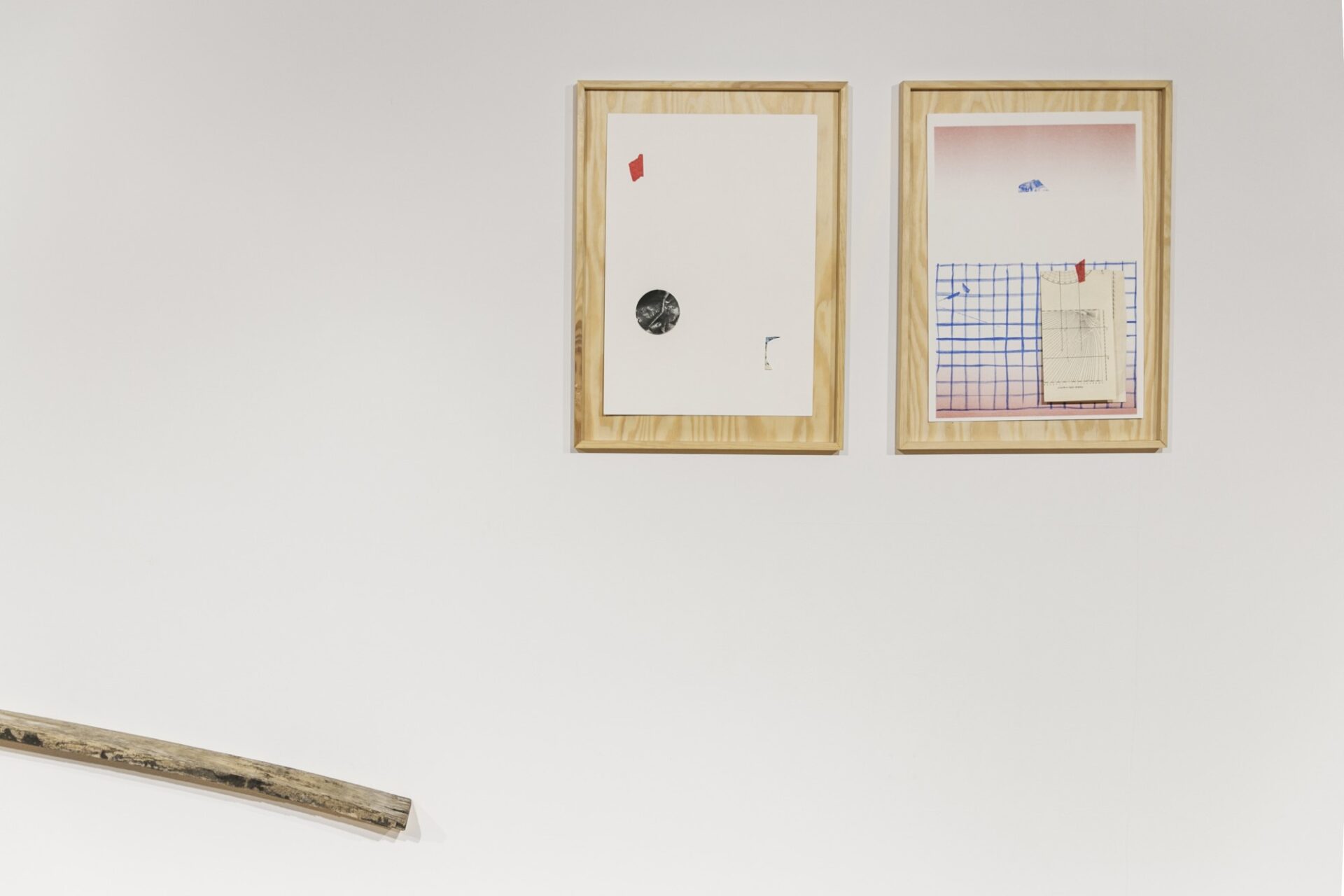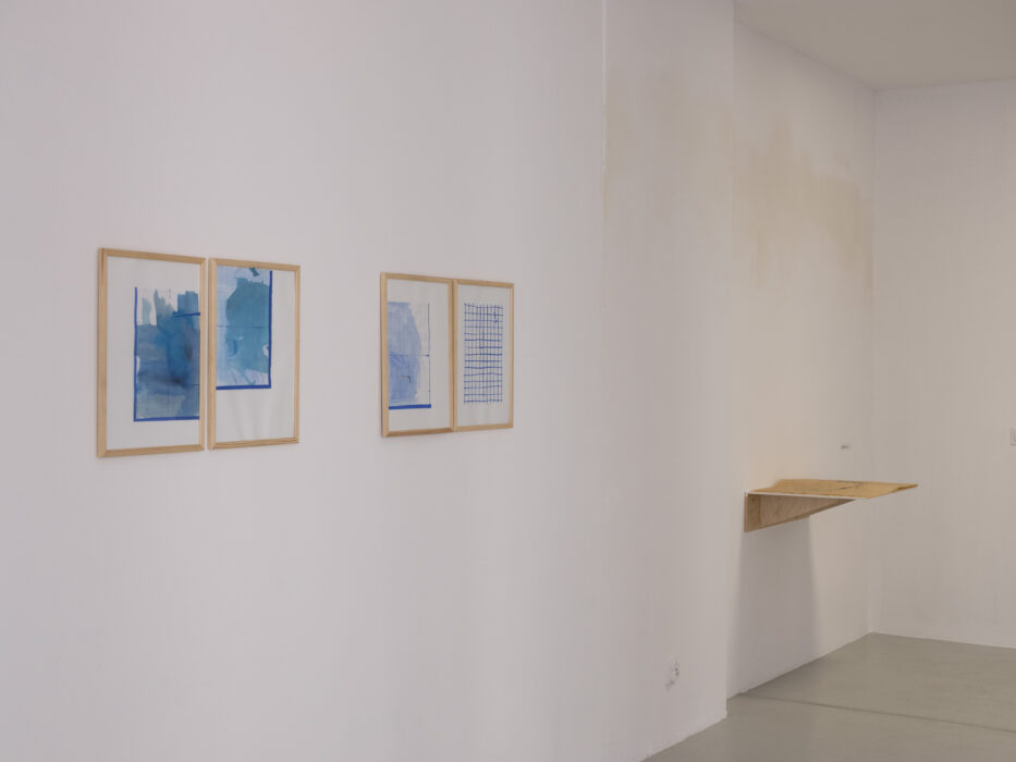 (instalacja; 2 akwarele, 3 akryle na płótnie, 40 x 40 cm, ekoliny – 7 sztuk, 21 x 29 cm) oraz RYSUNKI NAWIGACYJNE (4 kolaże, 30 x 42 cm, 2 monotypie, drewno) / prace zaprezentowane premierowo na wystawie pt. WSPÓLNE GESTY / kurator: R. Lewandowski / Bałtycka Galeria Sztuki Współczesnej, Słupsk (2023)