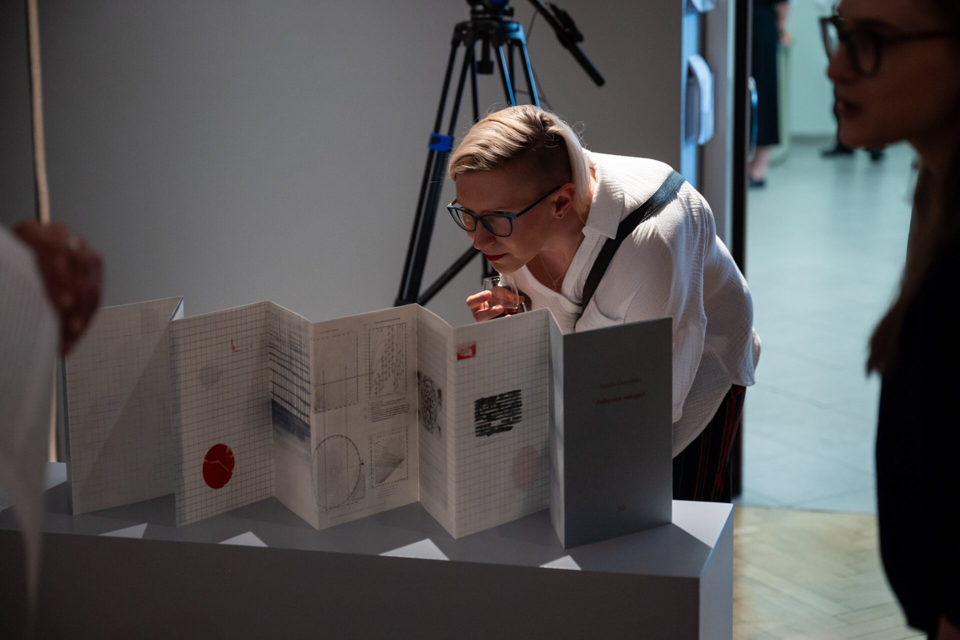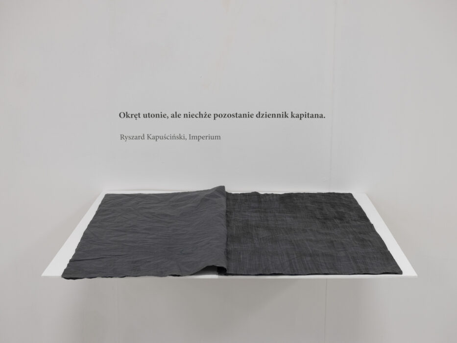 książka artystyczna na postumencie, LIFE LINA, lina bawełniana, sznurek, UTRZYMUJĄC RÓWNOWAGĘ, akryl na płótnie, 130 x 291 cm, ĆWICZENIA Z NAWIGACJI, wydruk riso na papierze / zaprezentowane premierowo na wystawie zbiorowej pt. WSPÓLNE GESTY / BWA Olsztyn (2024)