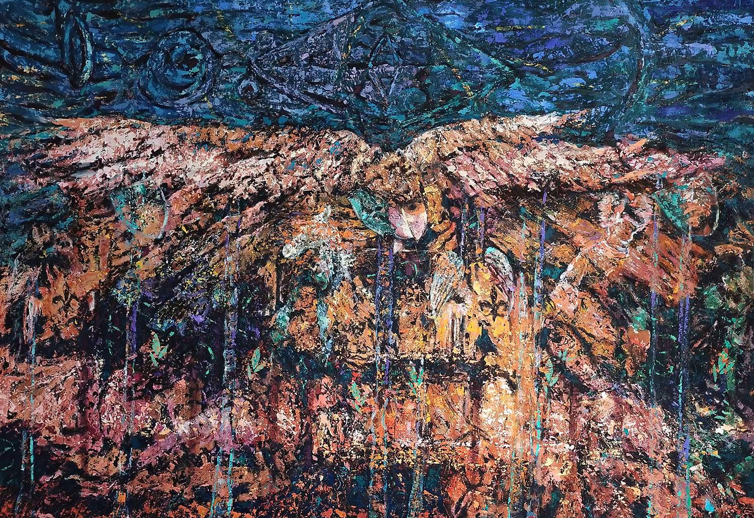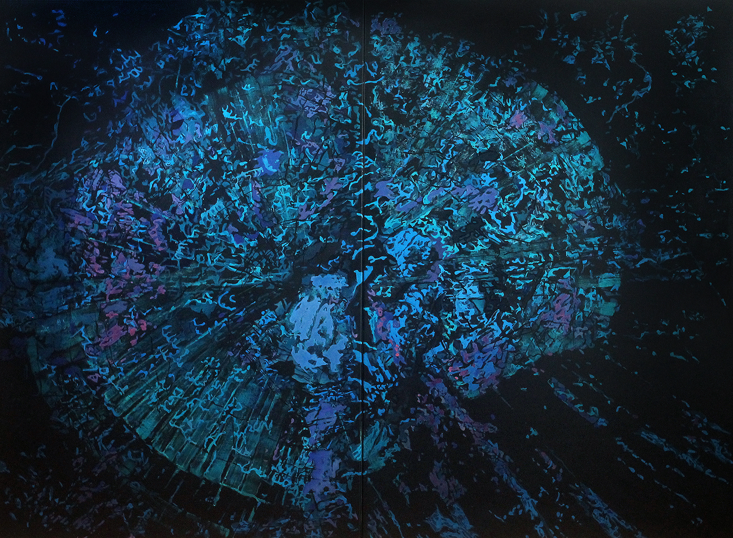 obrazy na płótnie: 10 x 120 x 170 cm, 2 x 120 x 85 cm, 2 x 170 x 240 cm, 3 grafiki 100 x 70 cm, 1 wydruk UV 70 x 200 cm, 3 obiekty o śr. 350 cm, realizacja video HD