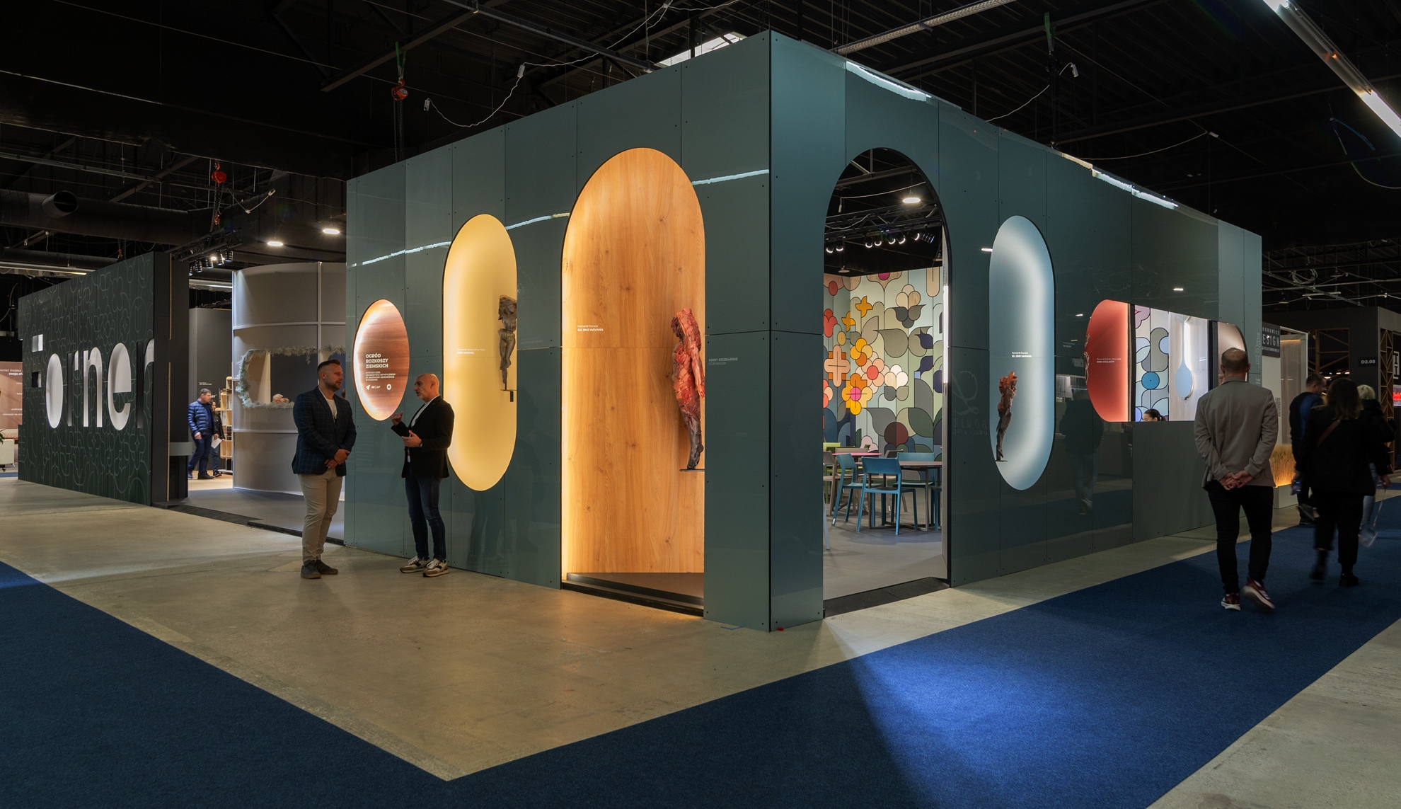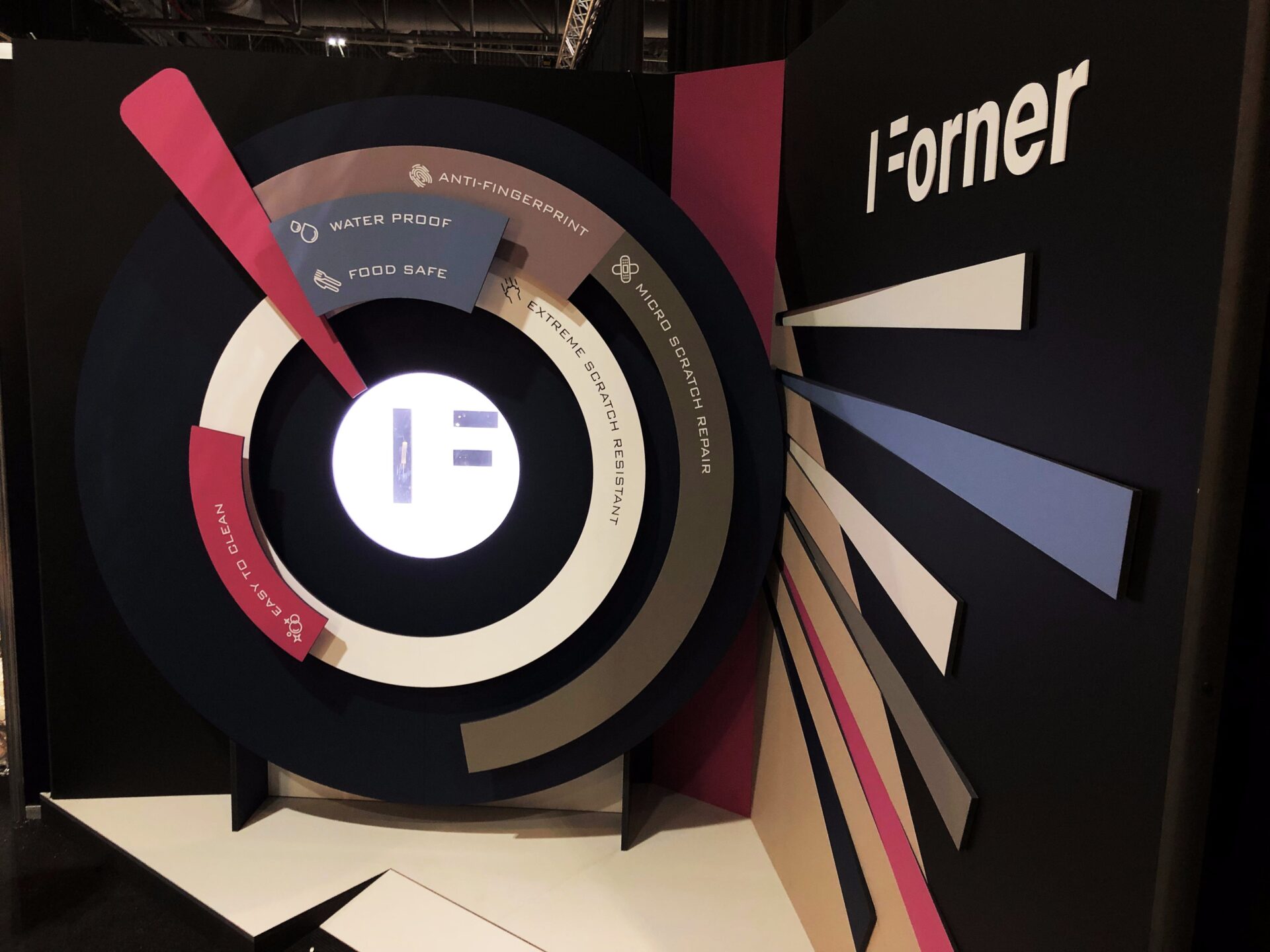 projekt scenografii wystawy podczas WARSAW HOME & CONTRACT 2024 na stoisku marki FORNER, producenta nowoczesnych i unikatowych materiałów dla rynku meblarskiego