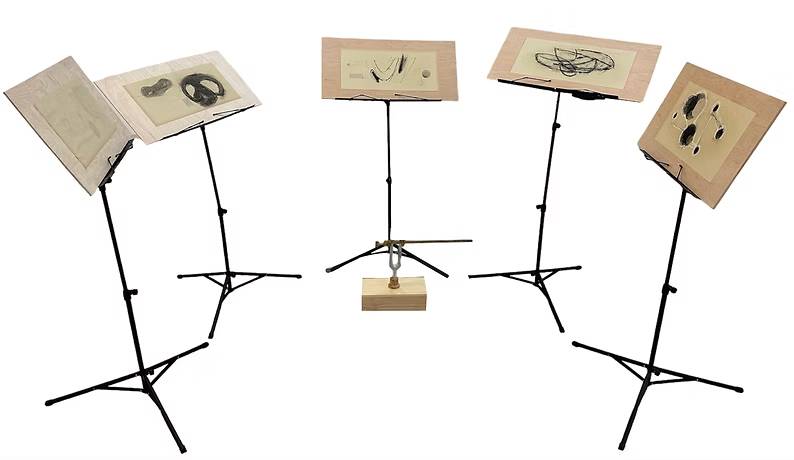 5 rysunków na sklejce, 60 x 30 cm; 5 pulpitów nutowych; spreparowany kamerton / IMPROWIZACJE książka artystyczna, 30 egzemplarzy., risografia