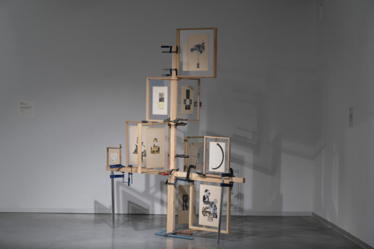 kompozycja przestrzenna złożona z 36 kolaży, tworząca rodzaj totemu o wymiarach 200 x 200 x 150 cm