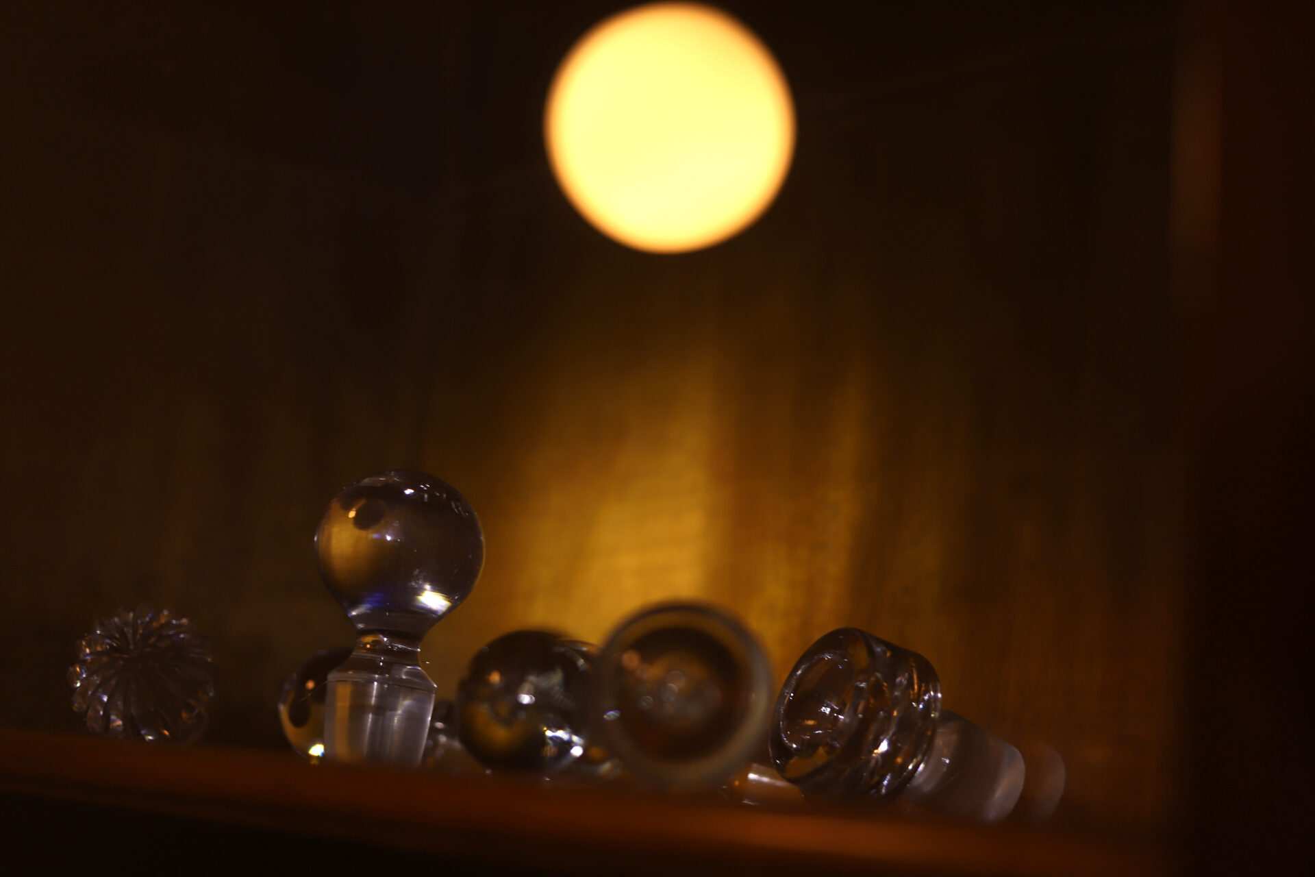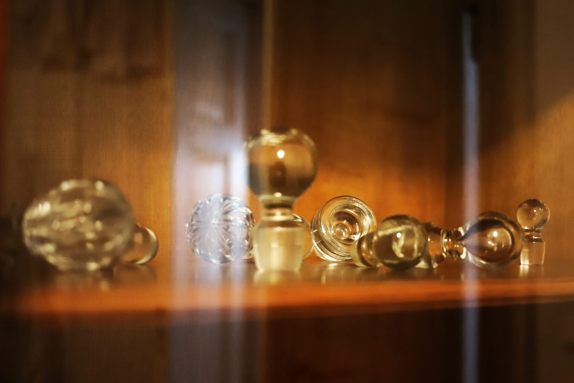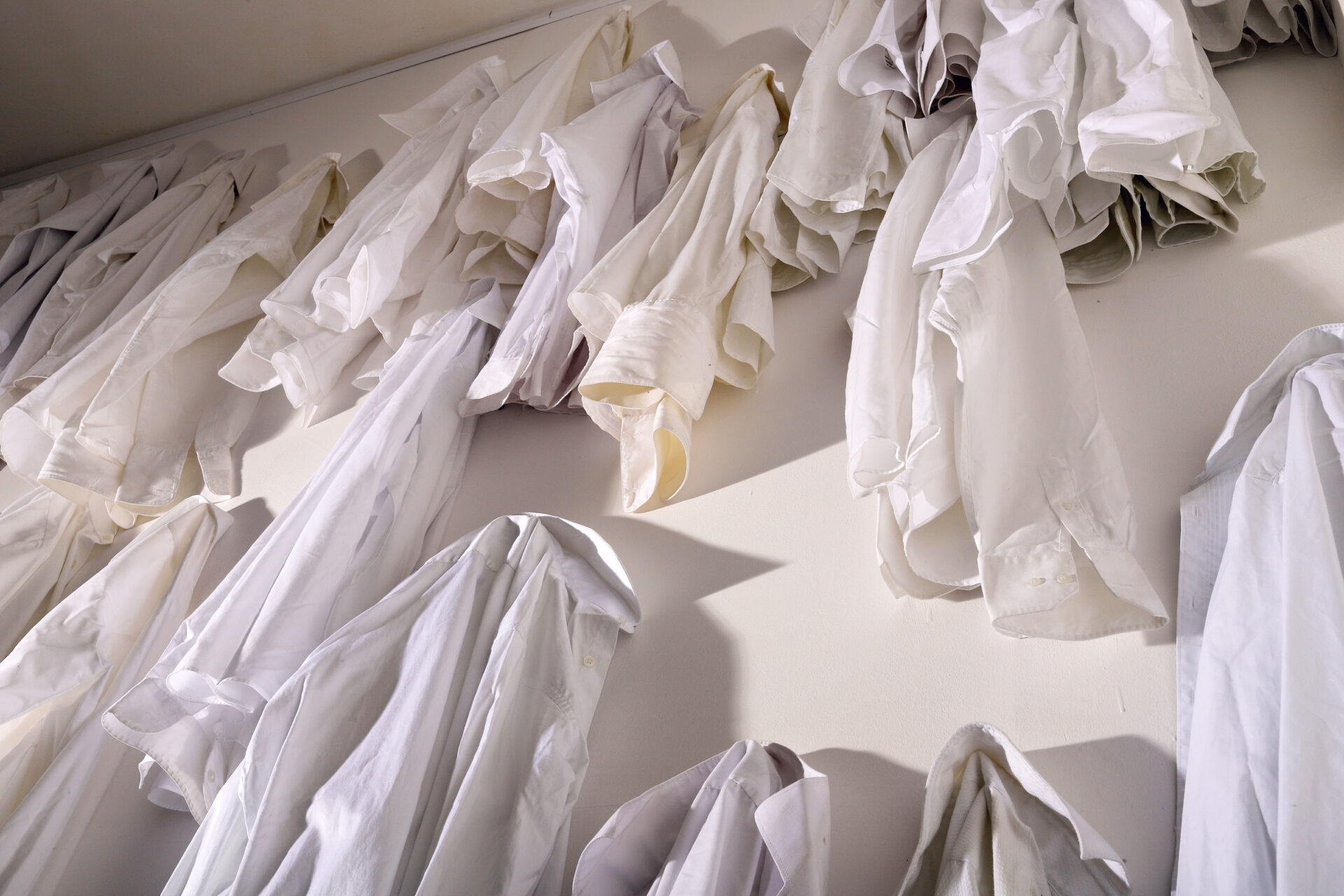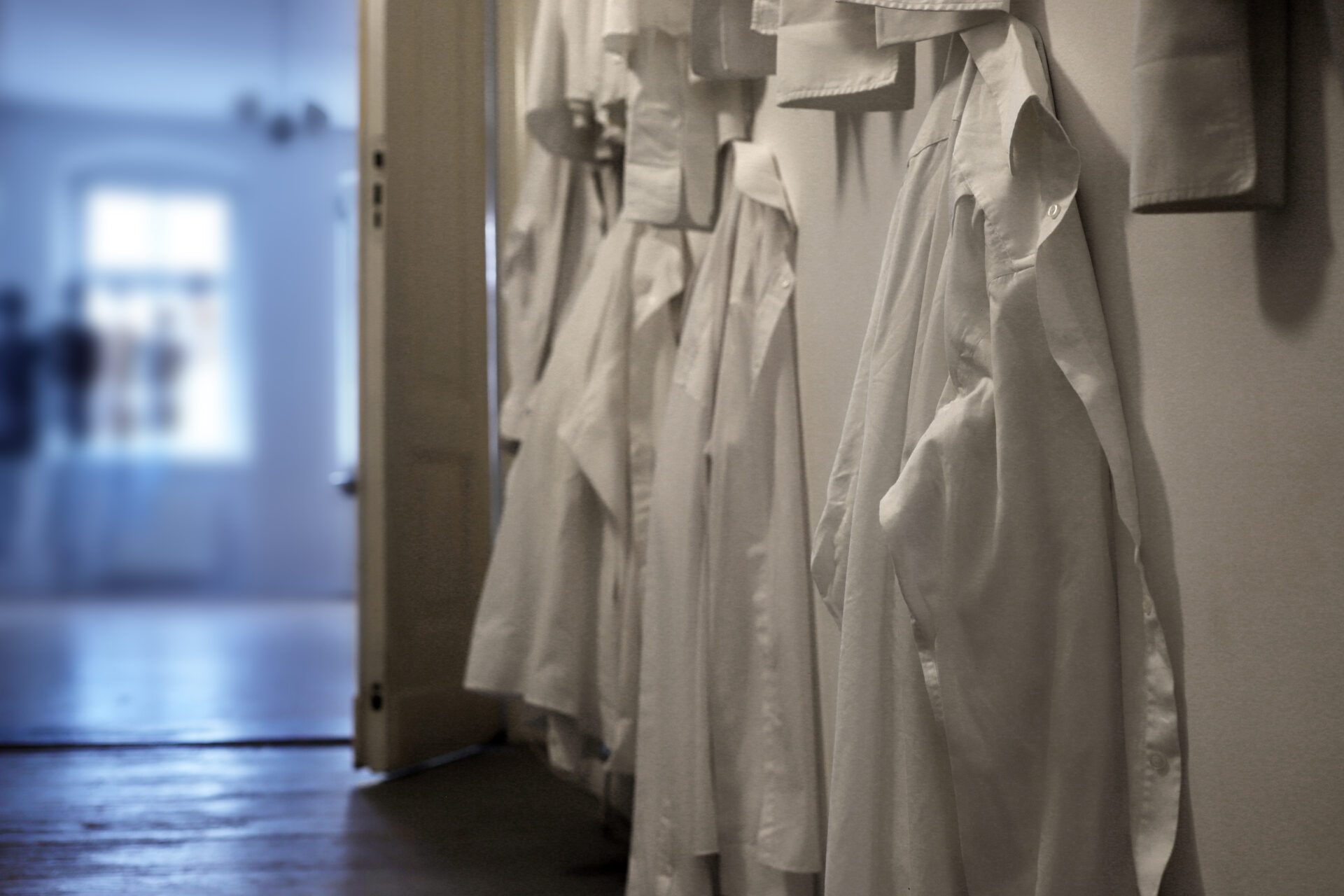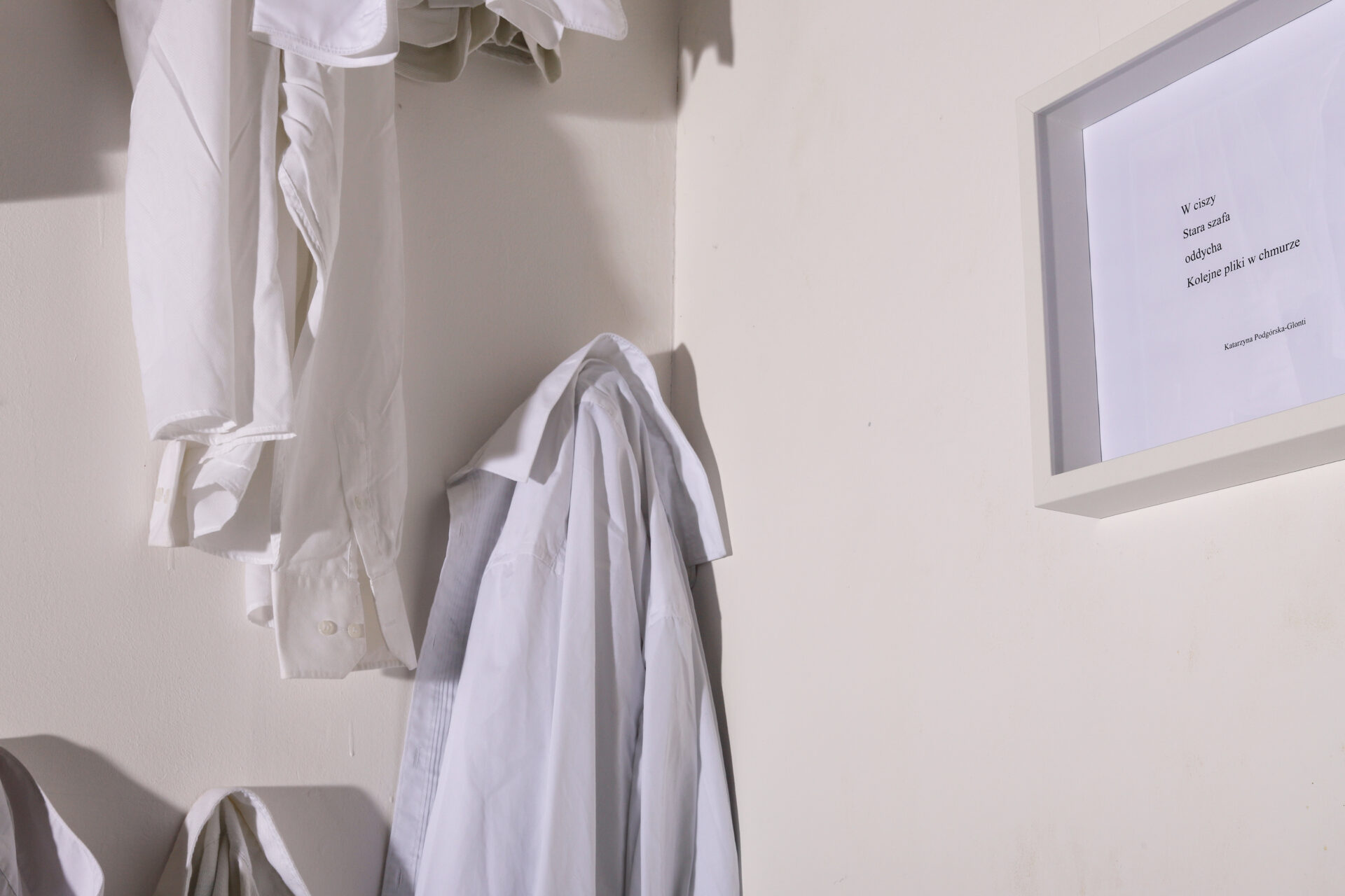 instalacja site-specific, Białe koszule, kryształowe obiekty, szafa