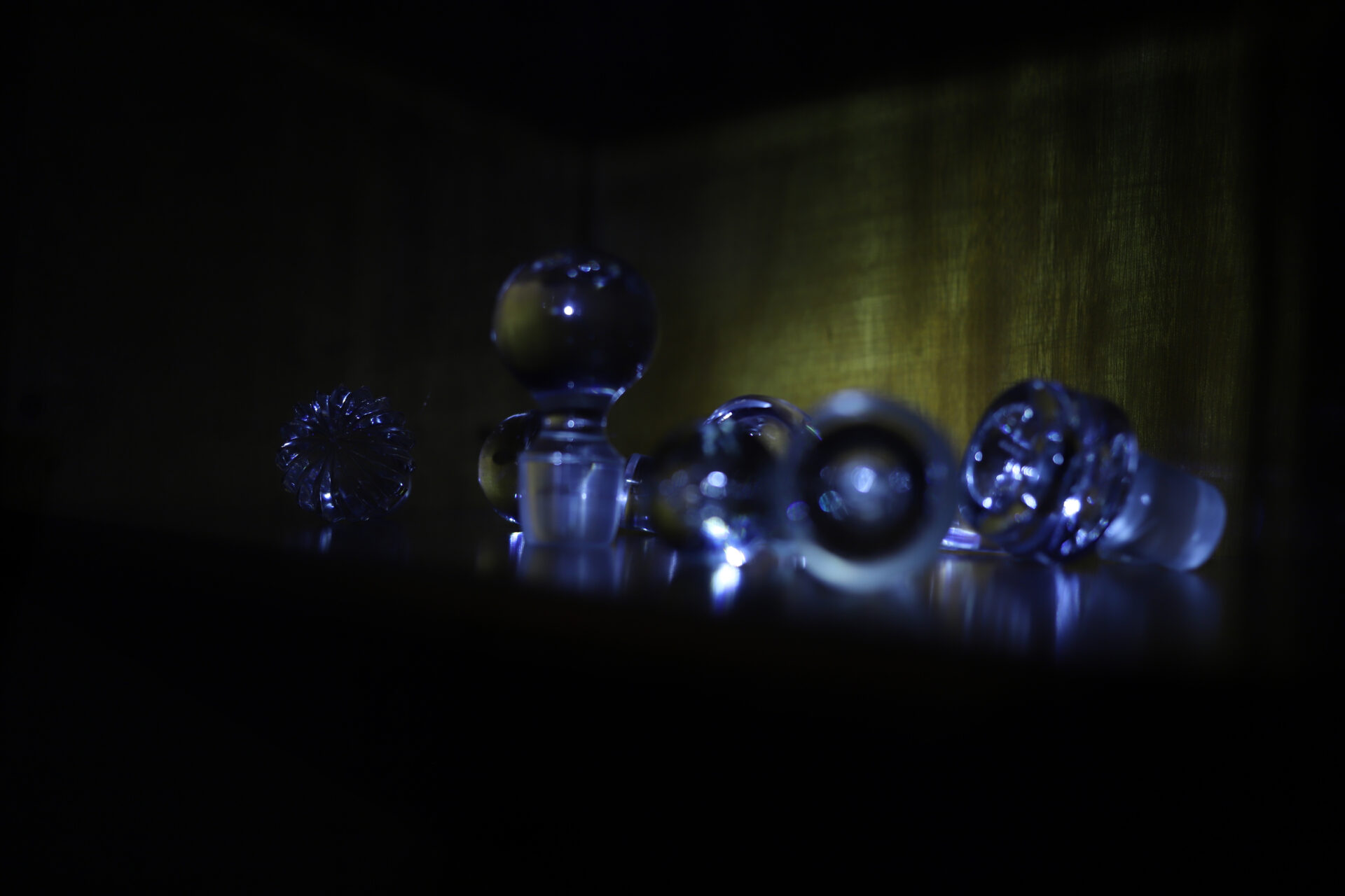 cykl prac – kryształowe obiekty, dzieło multimedialne, 7 fotografii na plexi, wystawa indywidualna