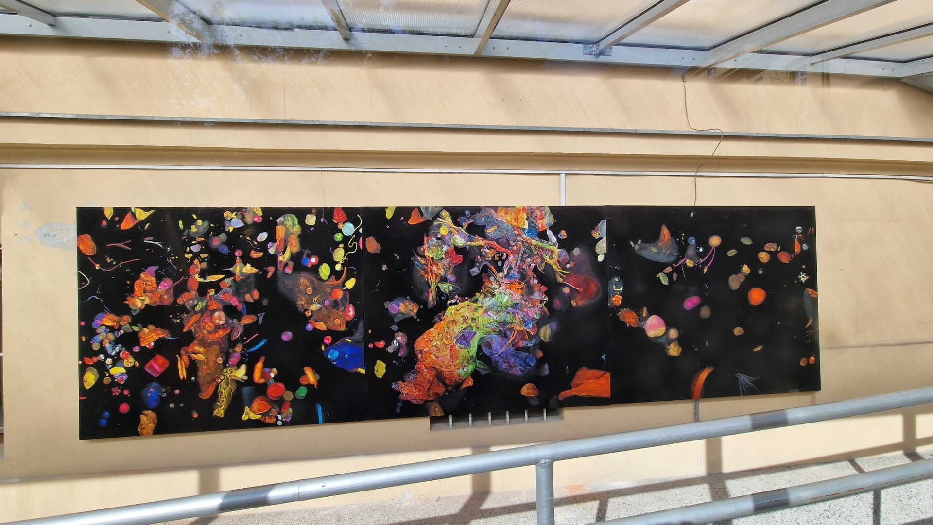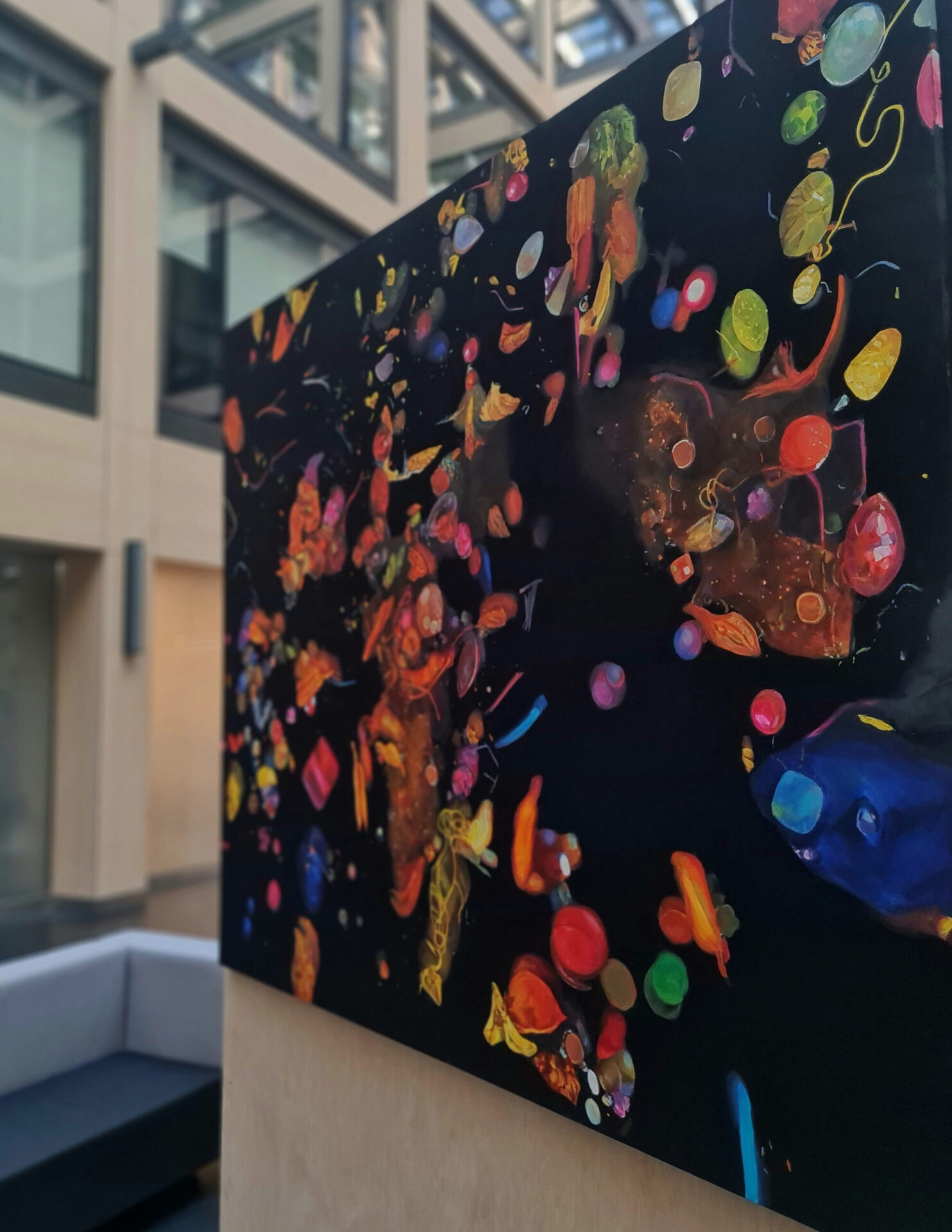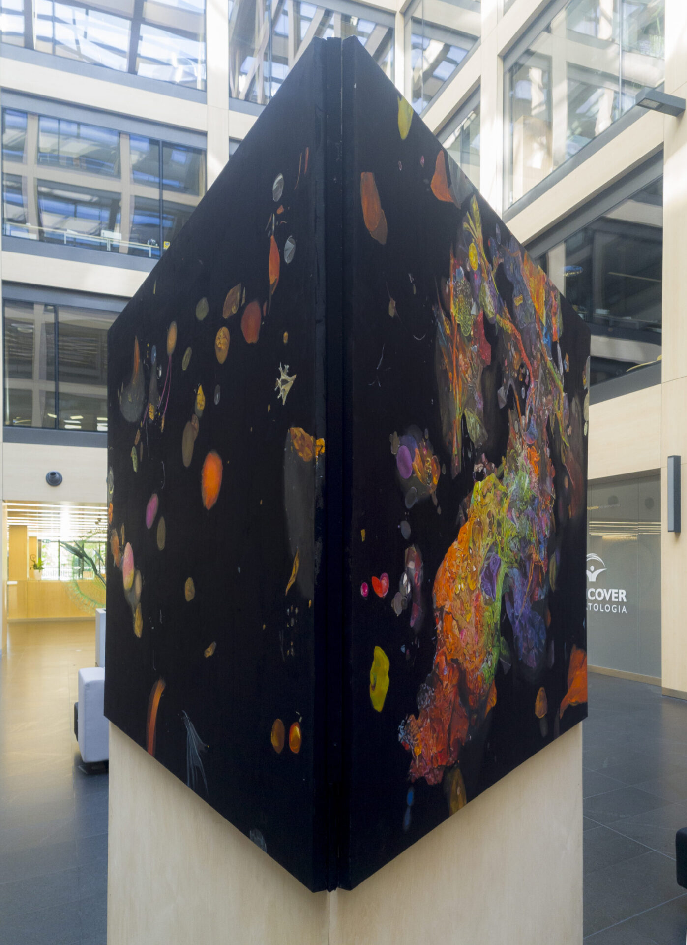 instalacja malarska: akryl, olej, płótno, drewniany prostopadłościan na planie trójkąta, 3 x 150 x 180 cm / 15. Festiwal Sztuki w Przestrzeni Publicznej OTWARTE MIASTO / OPEN CITY. SHAPES OF BEAUTY / kurator: T. Wendland / Centrum Kultury i Galeria ROZDROŻA, Lublin (2023)