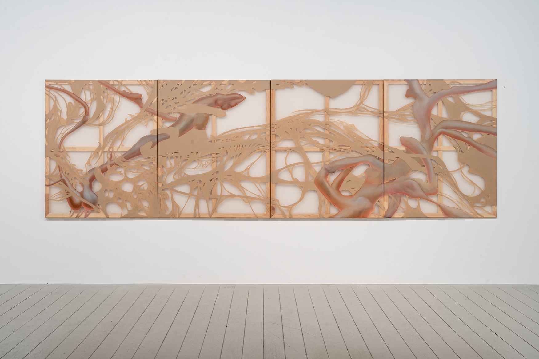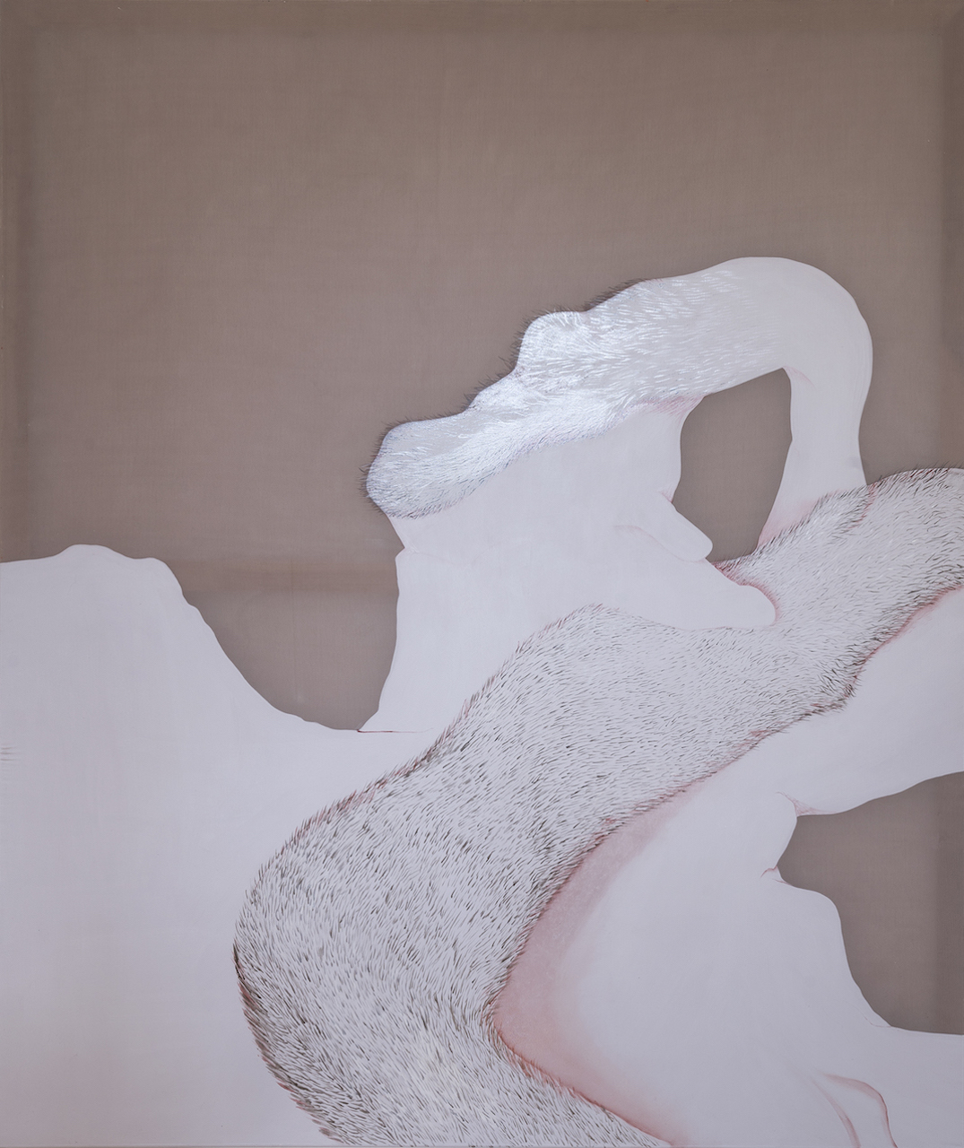 akryl i olej na organzie, 135 x 440 cm / prezentacja premierowa na wystawie pt. S M XL / Galeria na Dziedzińcu, Stary Browar, Poznań (2024)