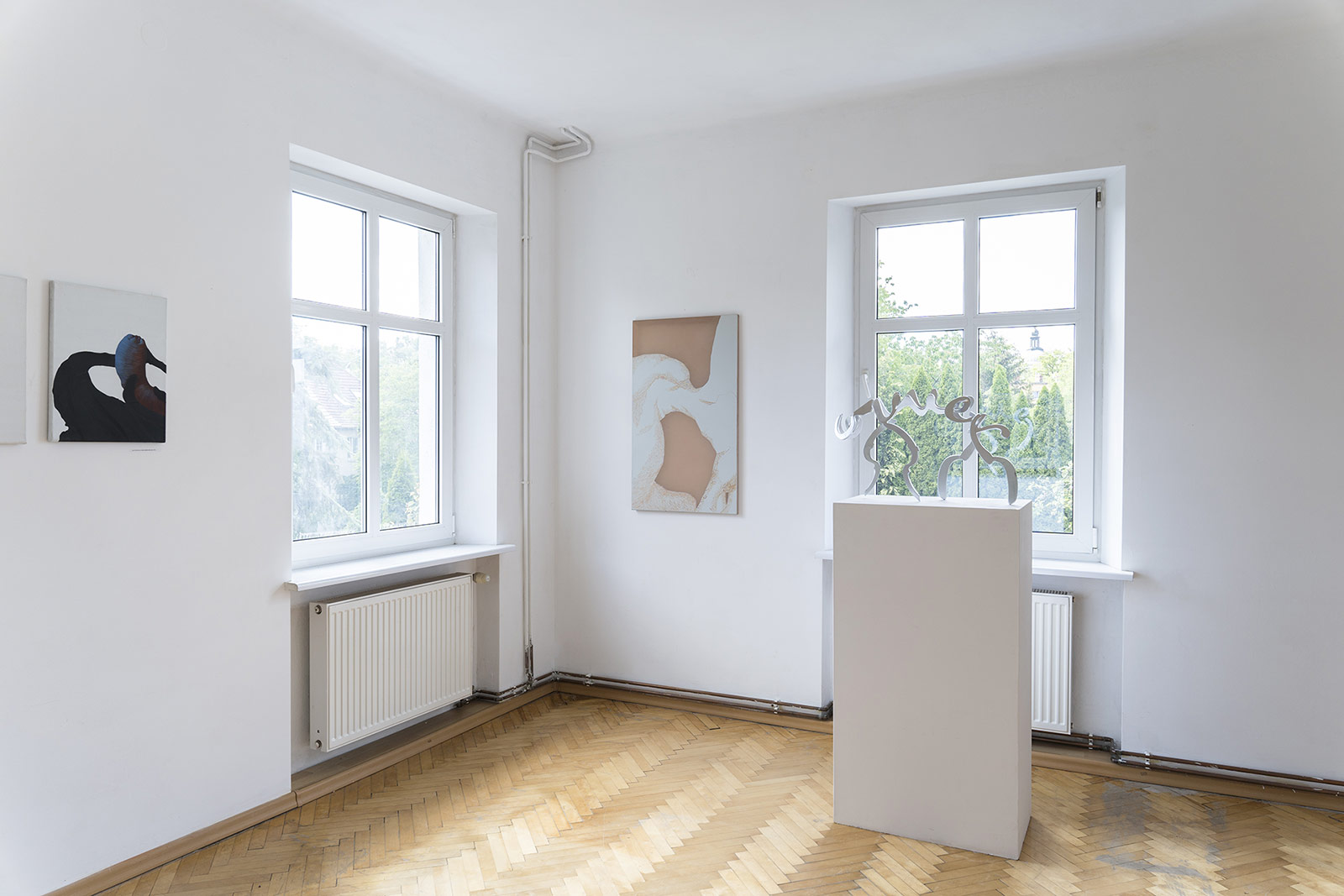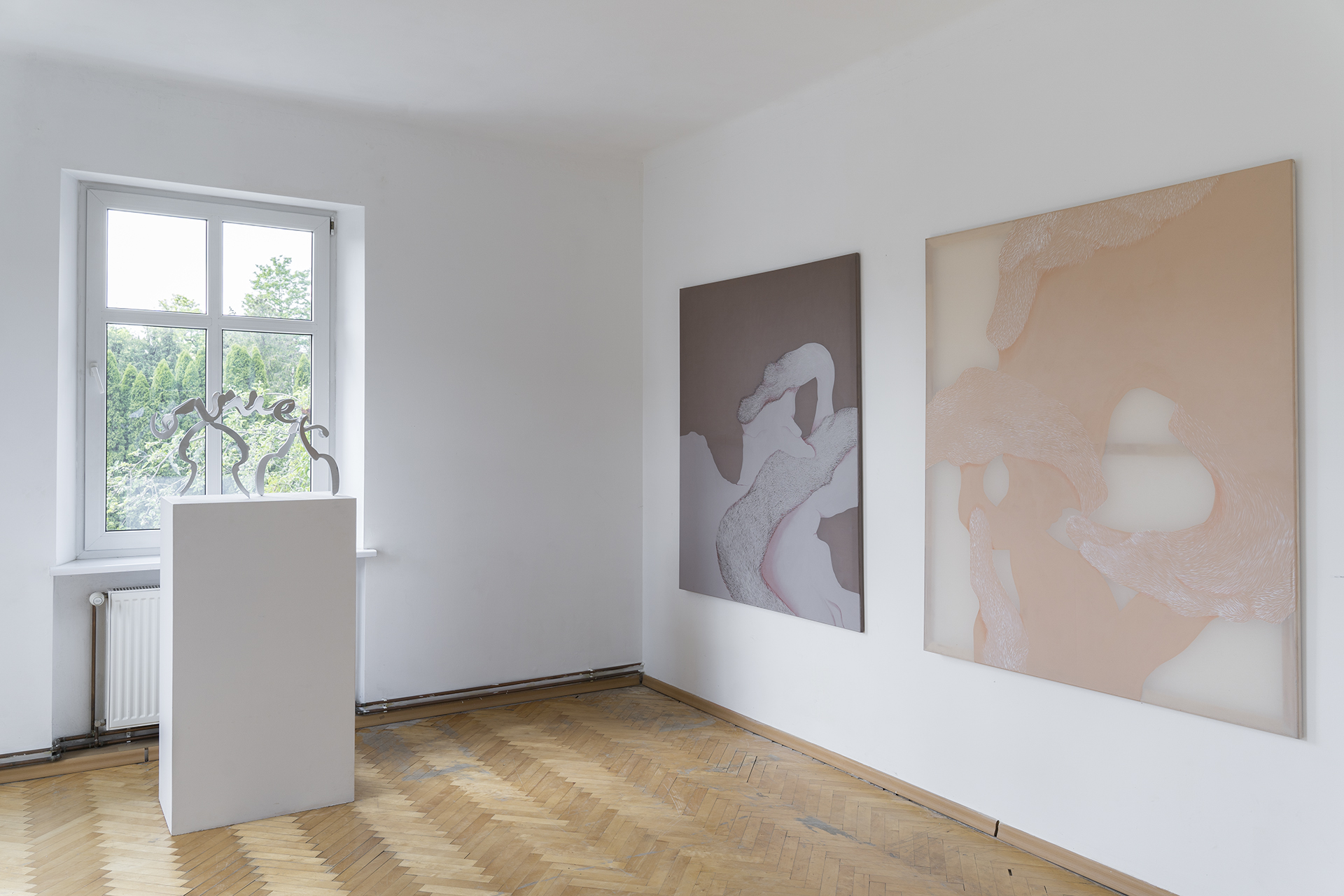 akryl i olej na półprzezroczystej tkaninie syntetycznej / 2 szt. 160 x 150 cm oraz 100 x 50 cm / prezentacja premierowa na wystawie zbiorowej pt. ZŁE WYCHOWANIE / kuratorzy: Julia Królikowska, Paweł Flieger / w ramach Poznań Art Week (PAW) / ul. Wołyńska 9, Poznań (2022)