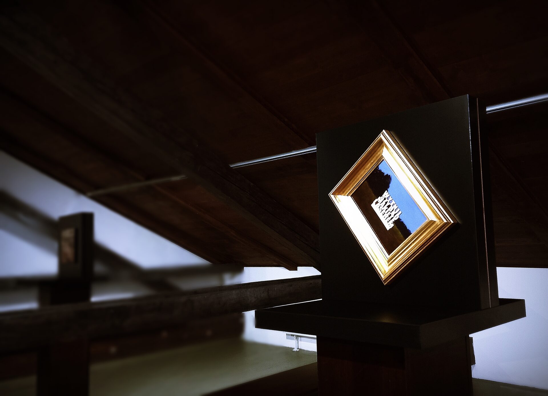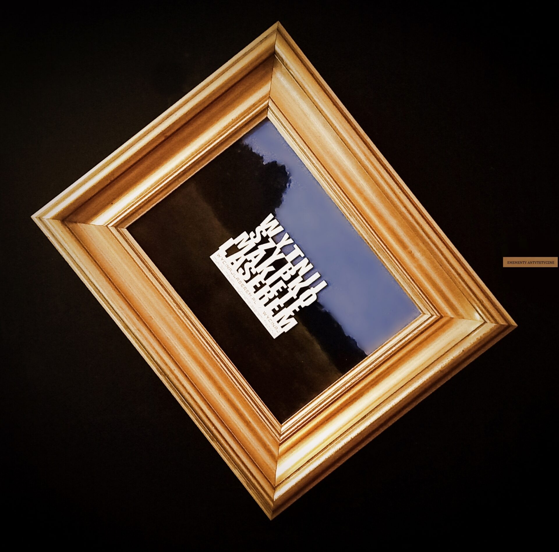 combine painting: akryl na desce,18×24 cm + napis rekl. w balsie (WYTNIJ SZYBKO MAKIETĘ LASEREM), rama+czarny ekran eksp. 55×55 cm