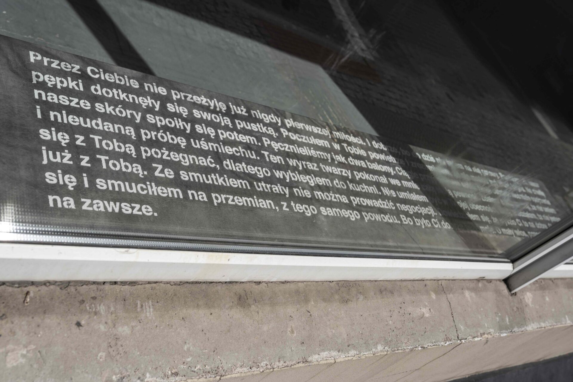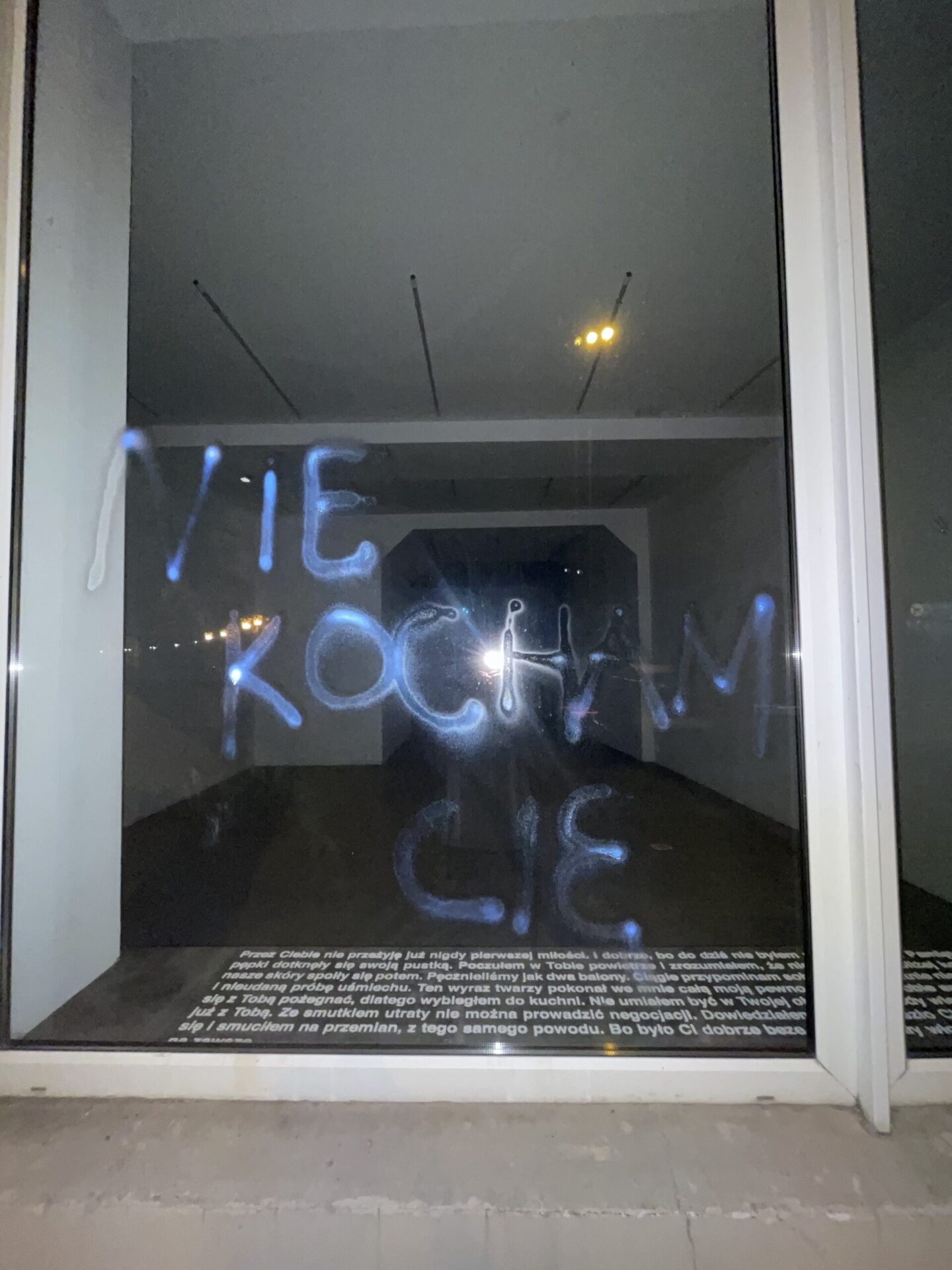 wystawa indywidualna (zaprezent. 1. obiekt – odlew mosiężny, ok. 11 cm, 2. napis utworzony z pyłu kamiennego, 3. działanie site-specific -napis na szybie witryny, widoczny w nocy pod wpływem światła latarki)