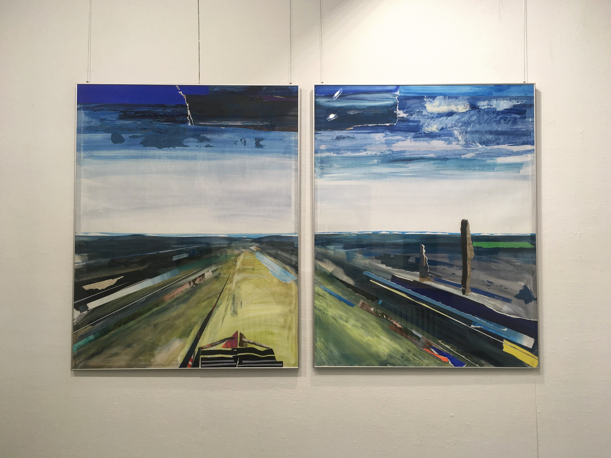 Malarstwo na papierze z zastosowaniem techniki kolażu (użycie preparowanych malarsko materiałów). Inspiracja pejzażem obserwowanym wzdłuż komunikacyjnych traktów uwzględniająca jego specyfikę, elementy infrastruktury oraz wpływ naturalnego sąsiedztwa. Badanie cech krajobrazu widzianego zza szyby pojazdu.