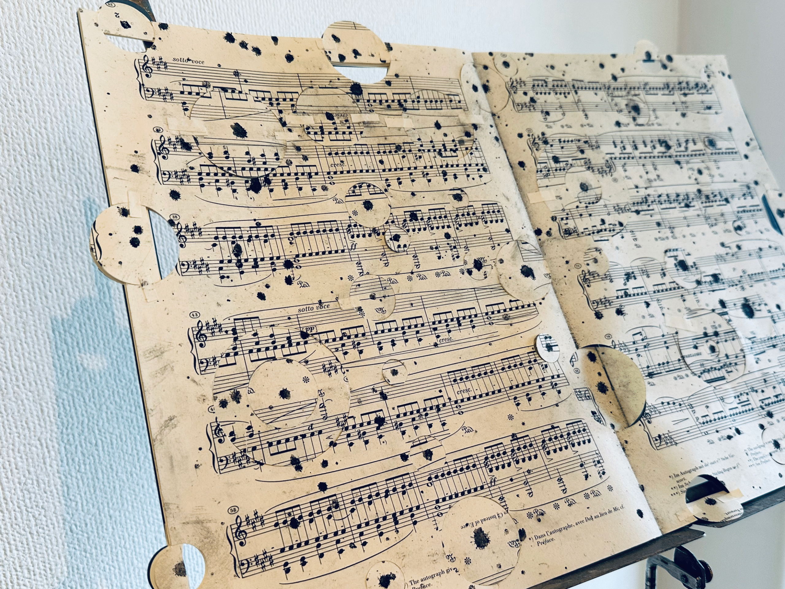 zmodyfikowana partytura, przedmiot gotowy, rysunek 42 x 30 x 130 cm, książka artystyczna, 30 egzemplarzy, risografia