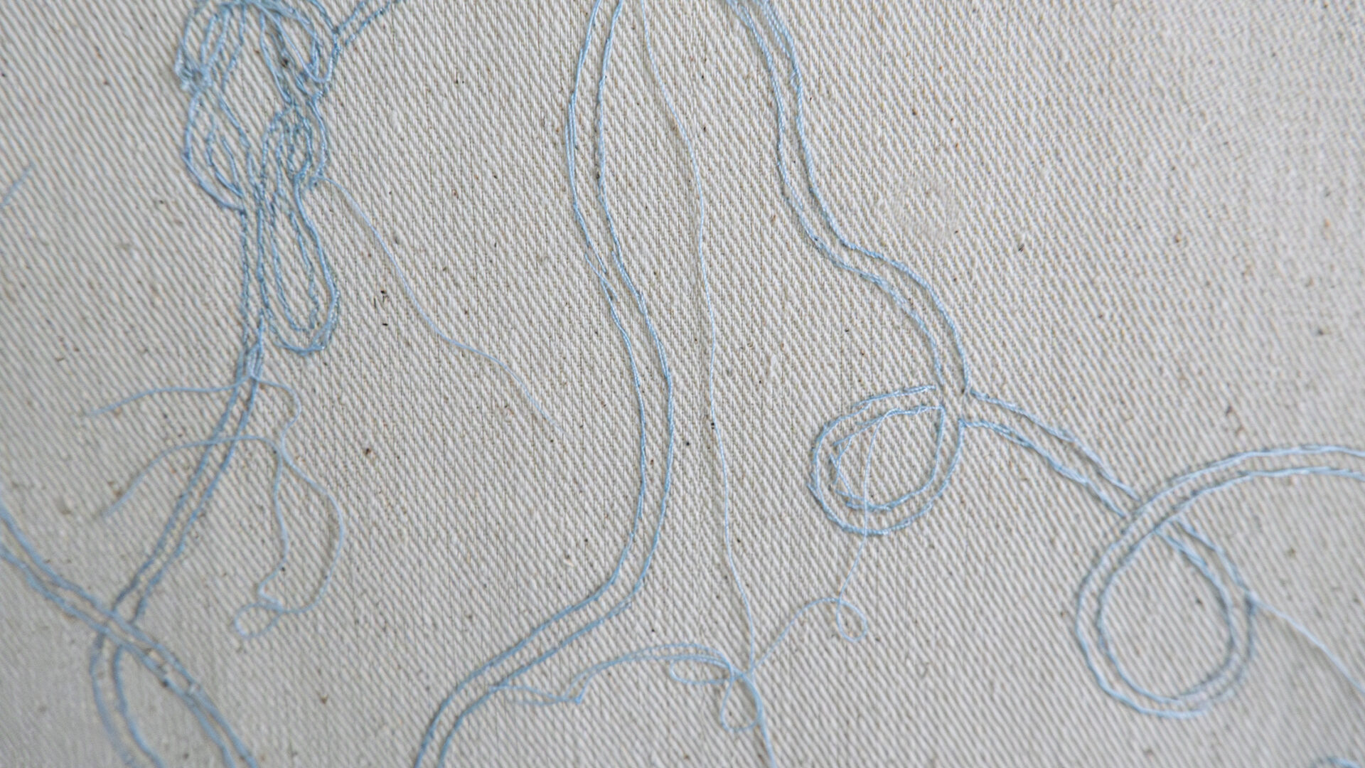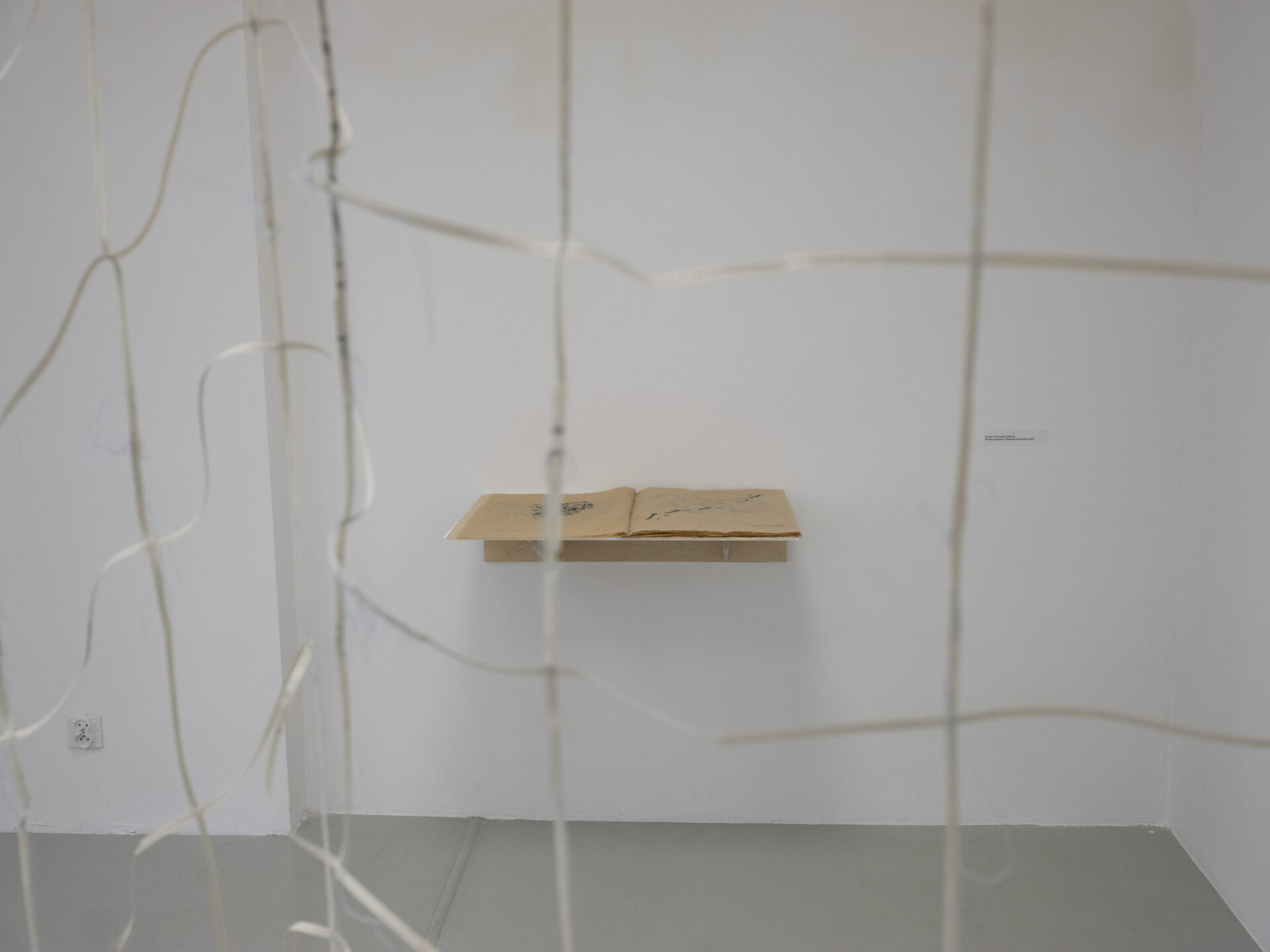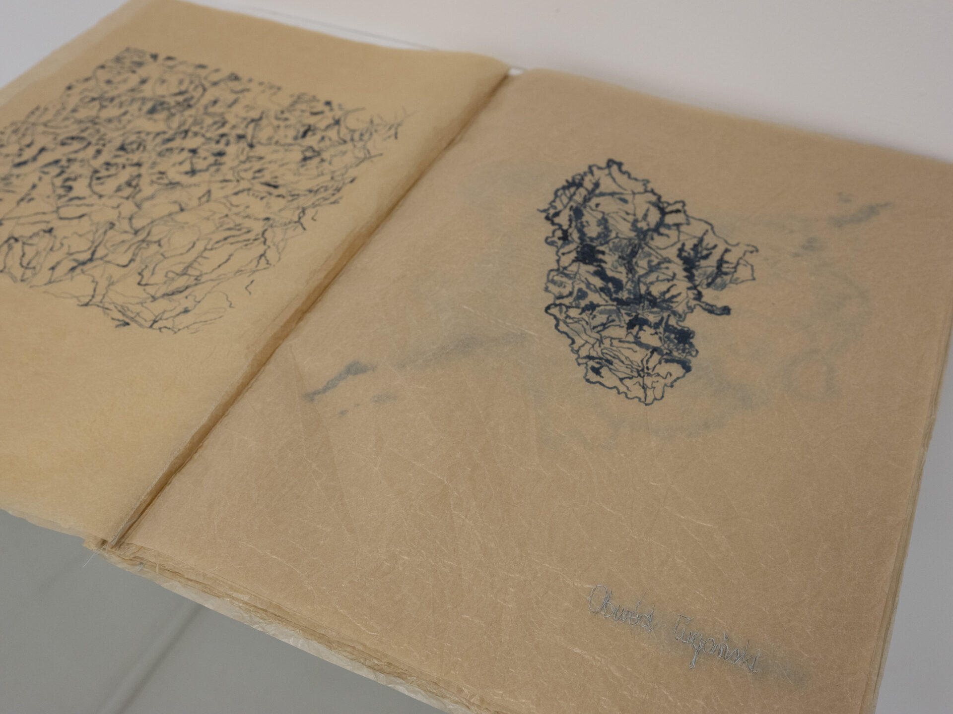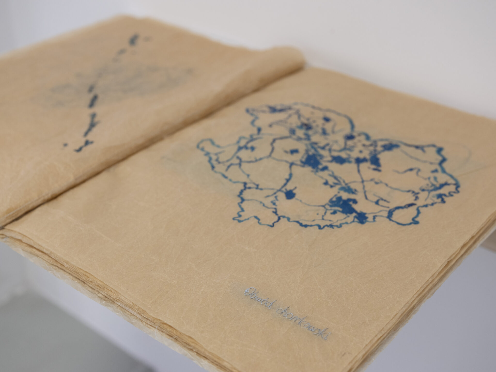 książka artystyczna: akwarela, haft na pergaminie 42 x 59 cm; WSPÓŁRZĘDNE, tkanina z map morskich 350 x 500 cm; KONEKSJE, tkanina: haft na surówce lniano-bawełnianej 100 x 80 cm
