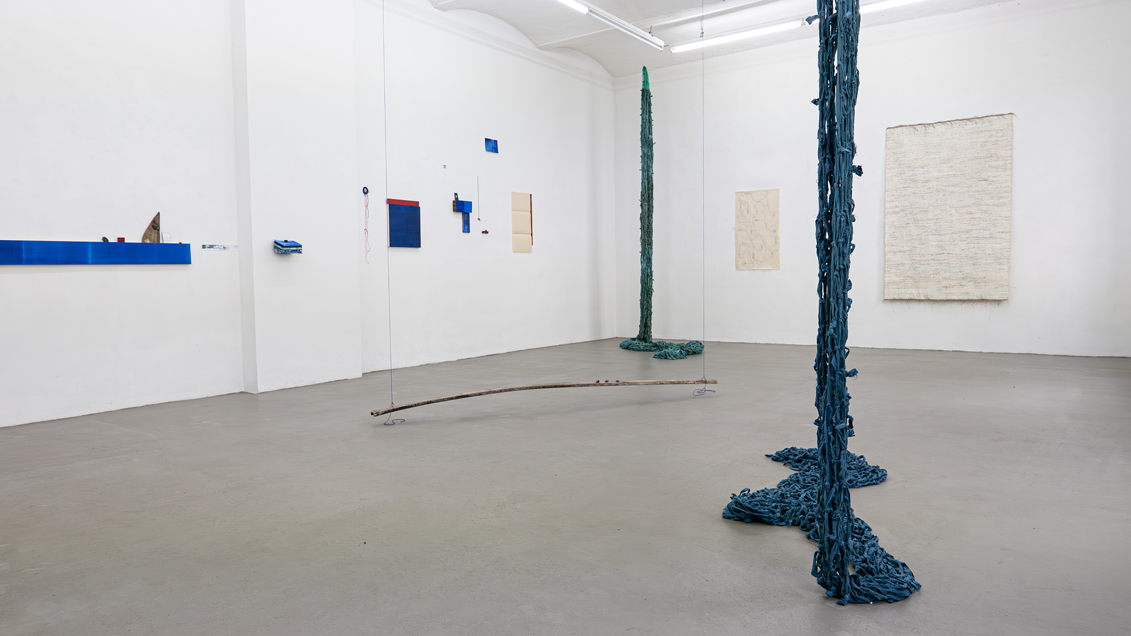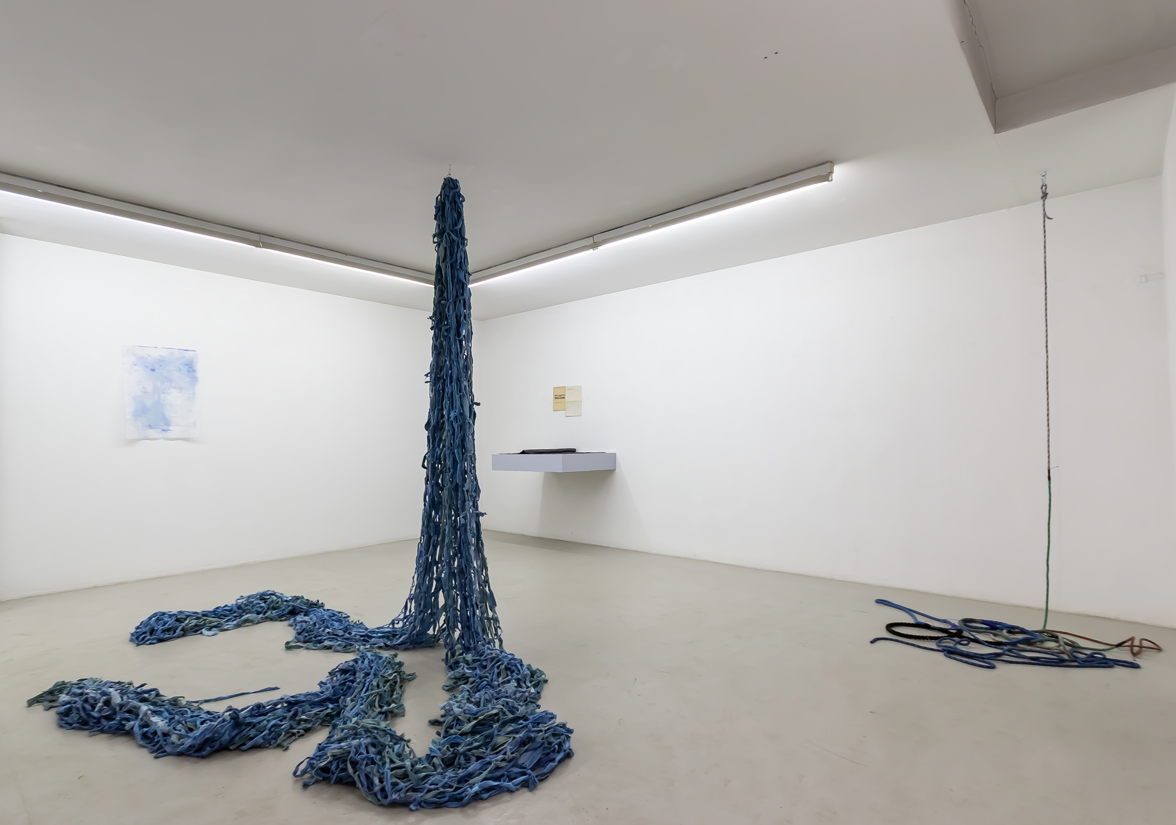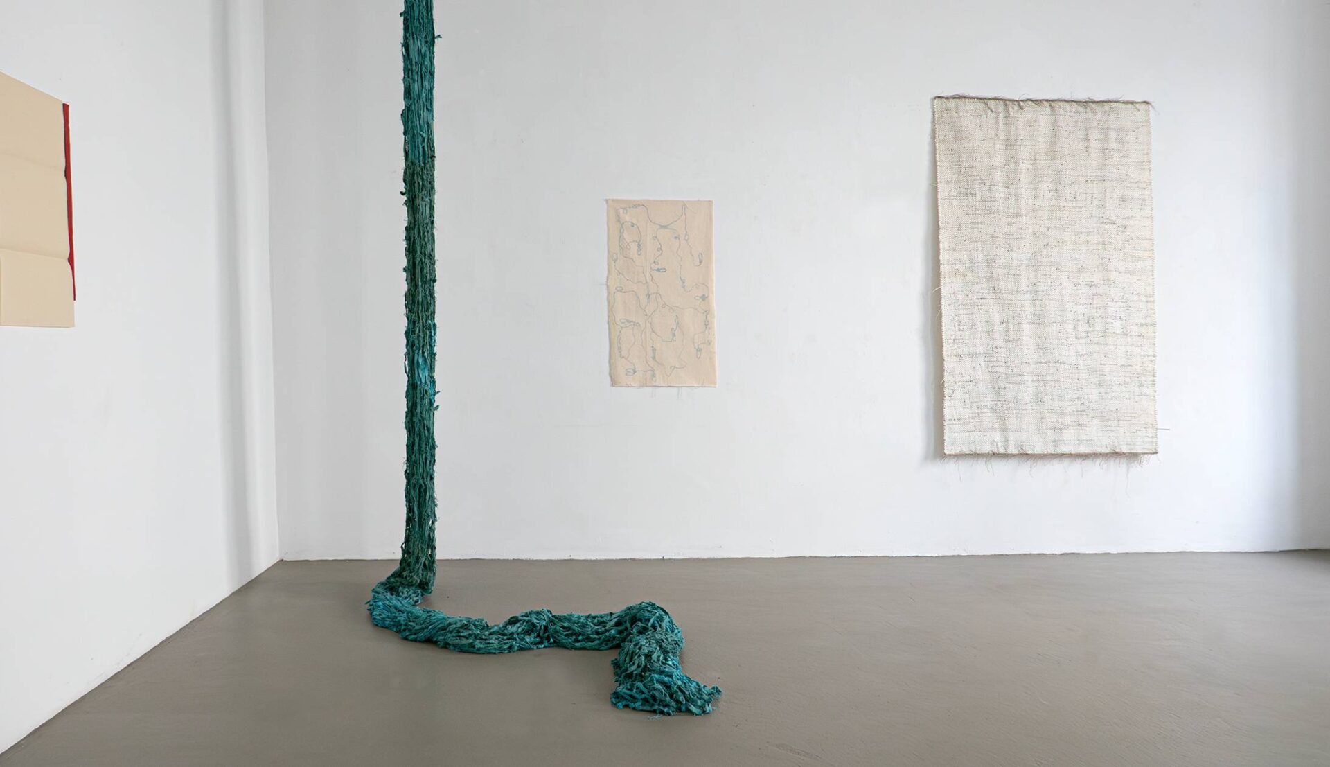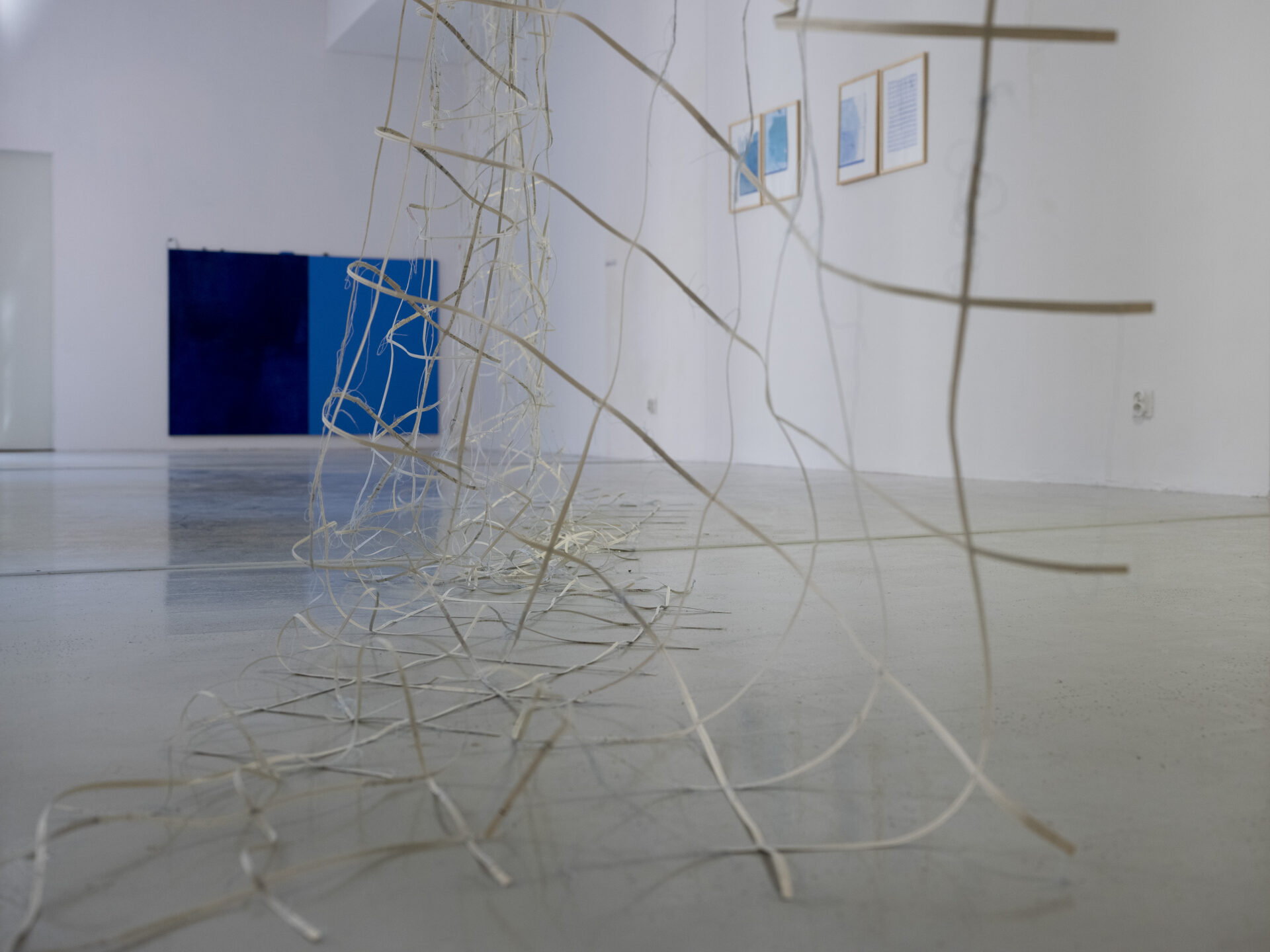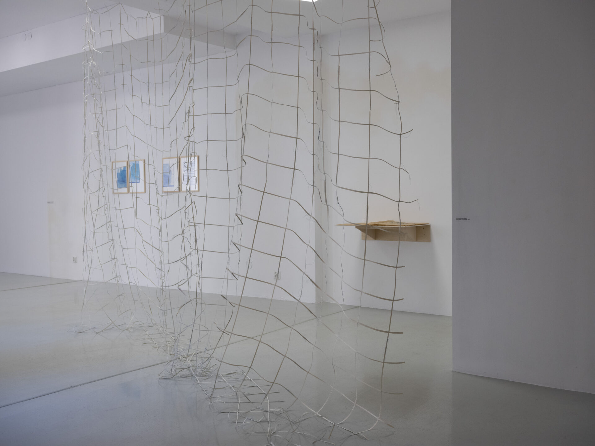 praca tkana, mapy; ŁĄCZNIKI artefakty z Bałtyku, plastik, nić; Z CYKLU TRAŁ. OD PRZYJACIÓŁ Z PÓŁNOCY, sieć, barwione tkaniny, długość około 8 m; Z CYKLU TRAŁ. OD PRZYJACIÓŁ MALARZY, sieć, podobrazia, długość. około 6m