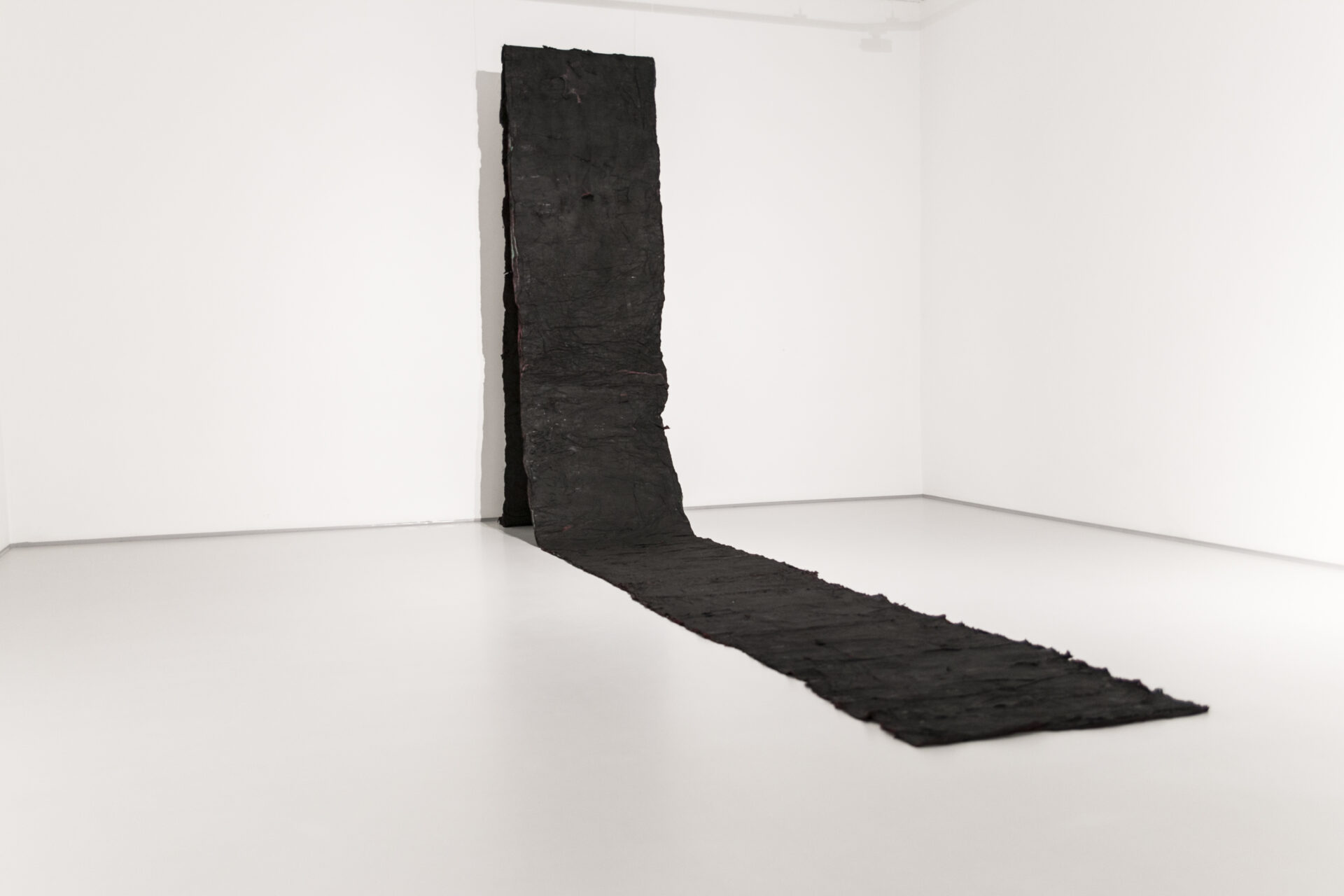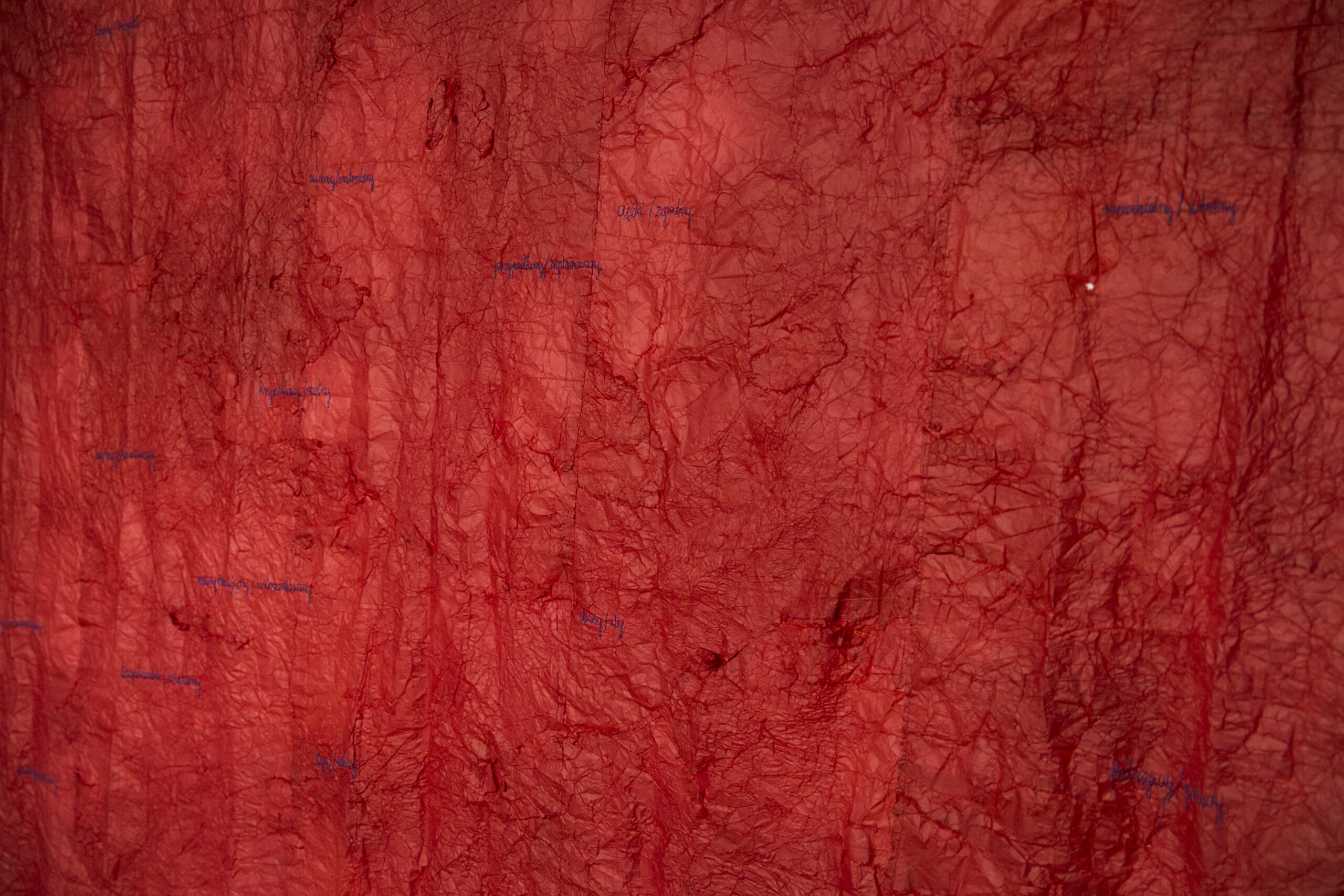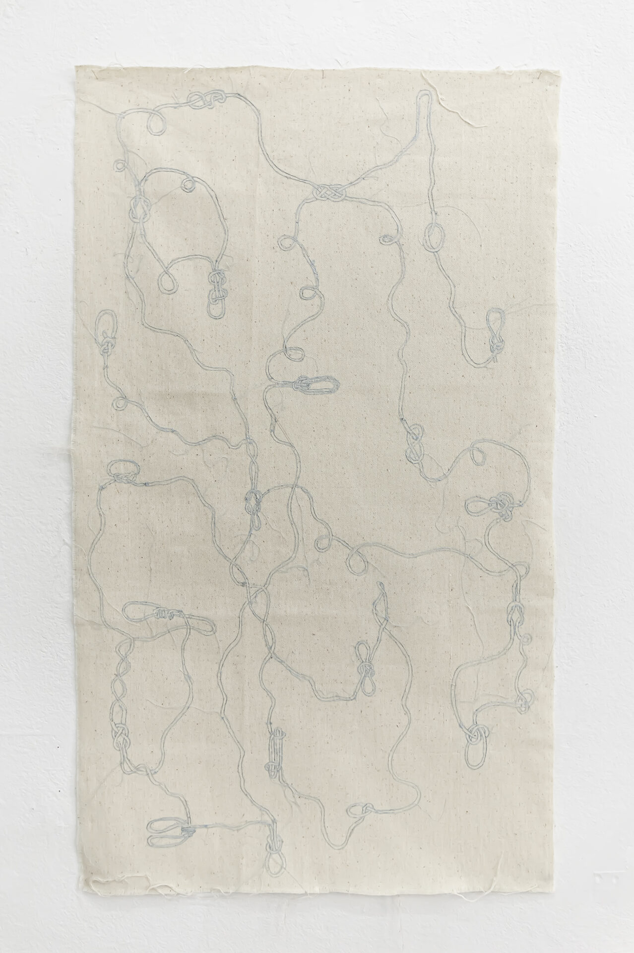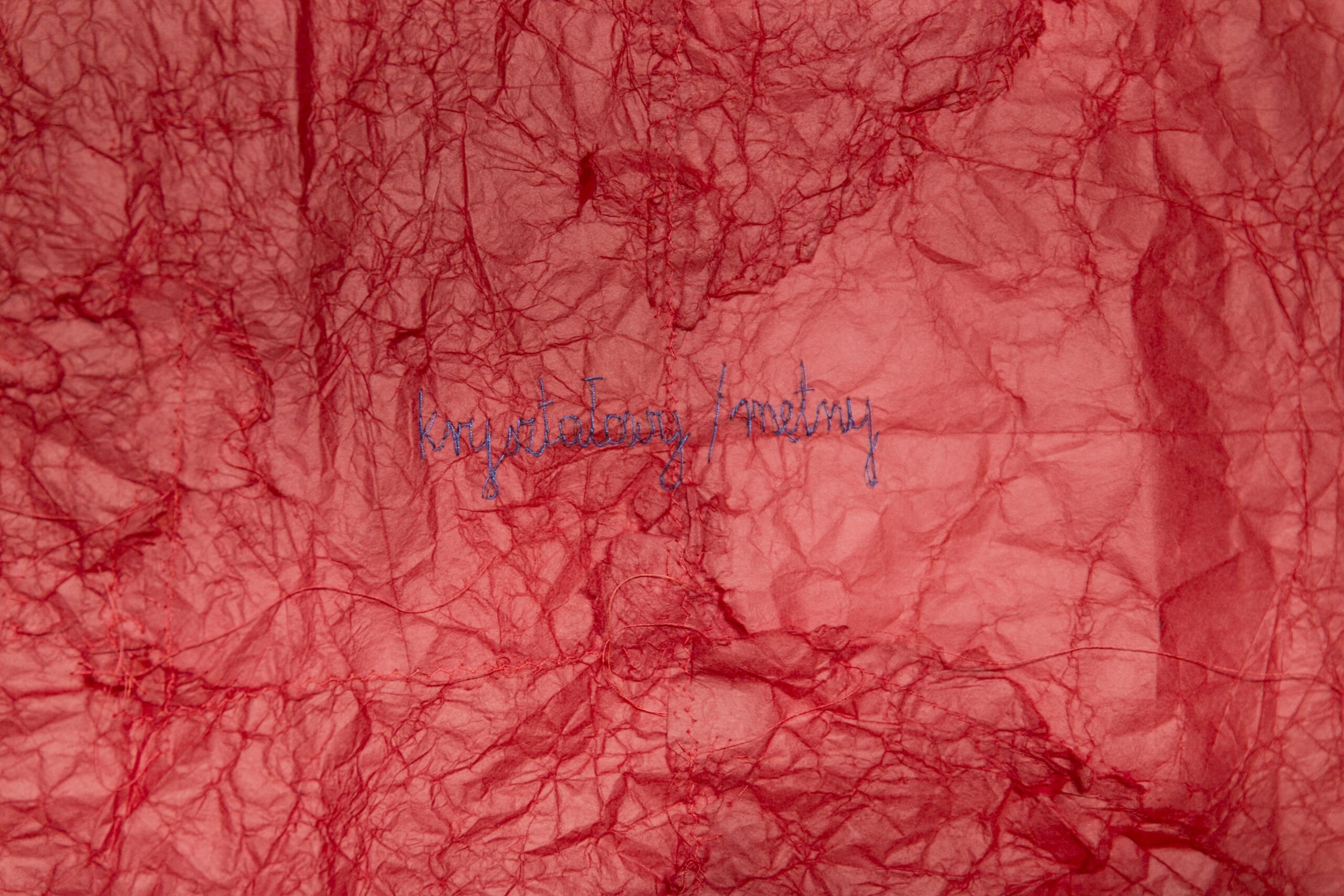 tkanina dł. ok. 10 m; POLE KWADRATU, papier barwiony ok. 2 x 2 m; RYSUNEK ODRĘCZNY, tkanina ; cykl RYSUNKÓW i SZKICOWNIK (Z CYKLU TWORZENIE FIGUR NIEMOŻLIWYCH); CODZIENNOŚĆ 164 x 215 cm, haft na barwionym papierze ryżowym