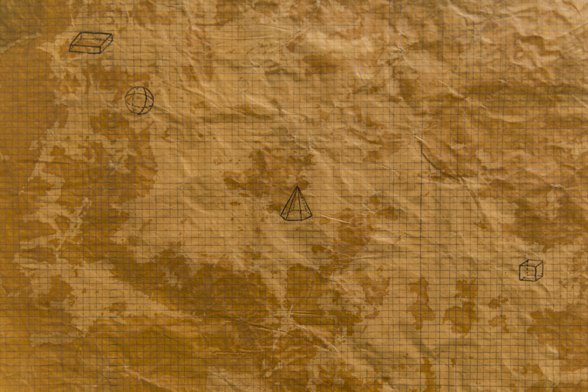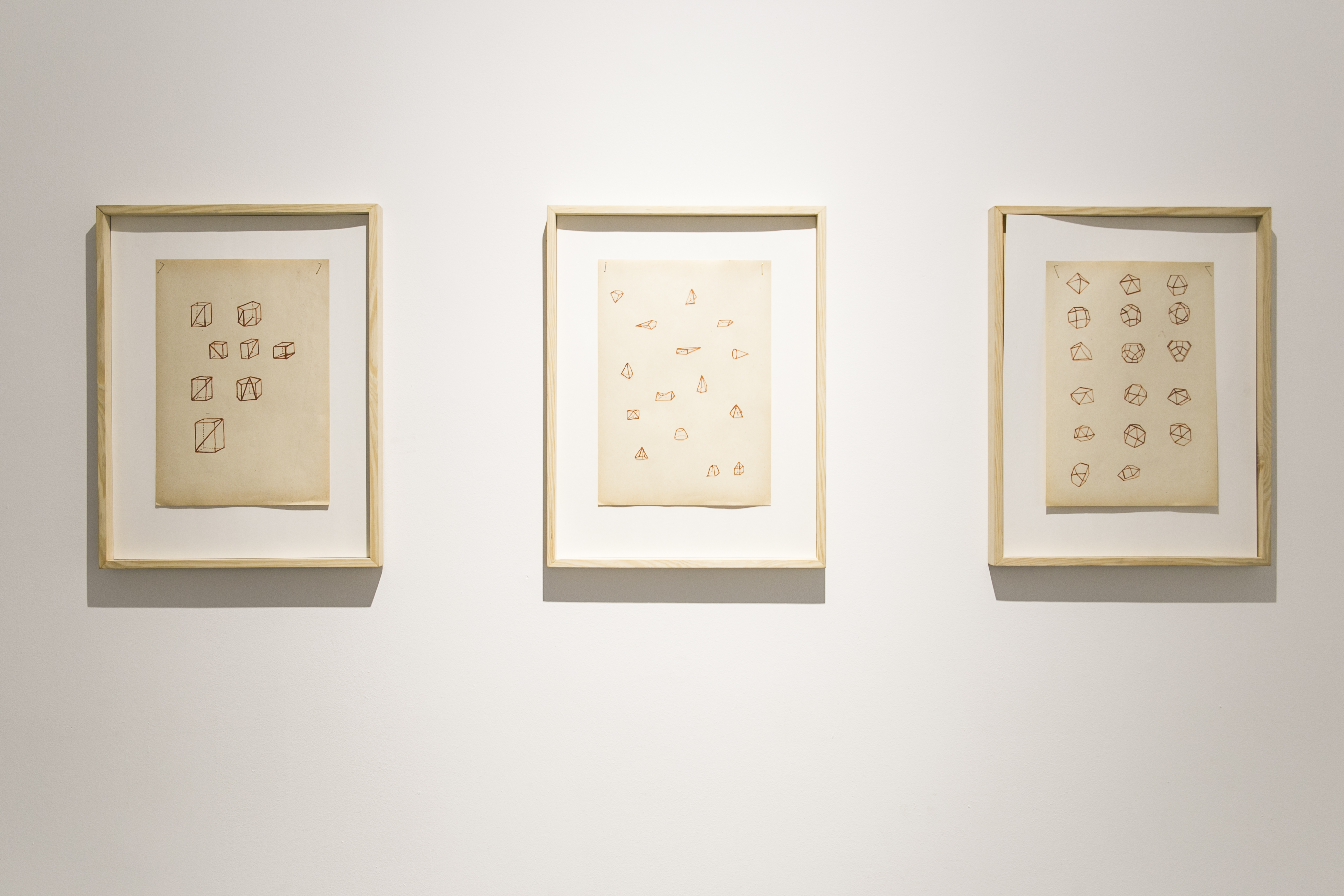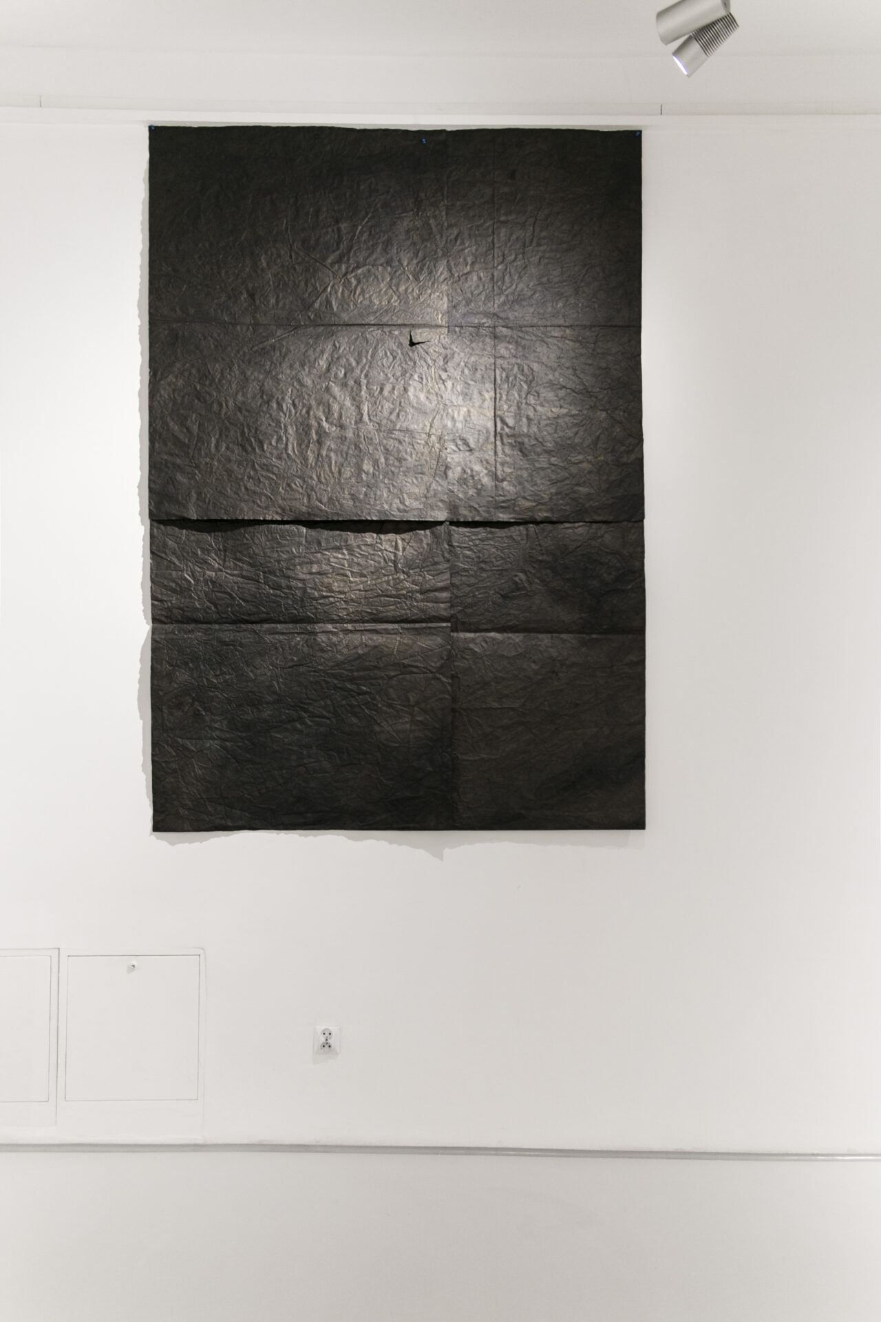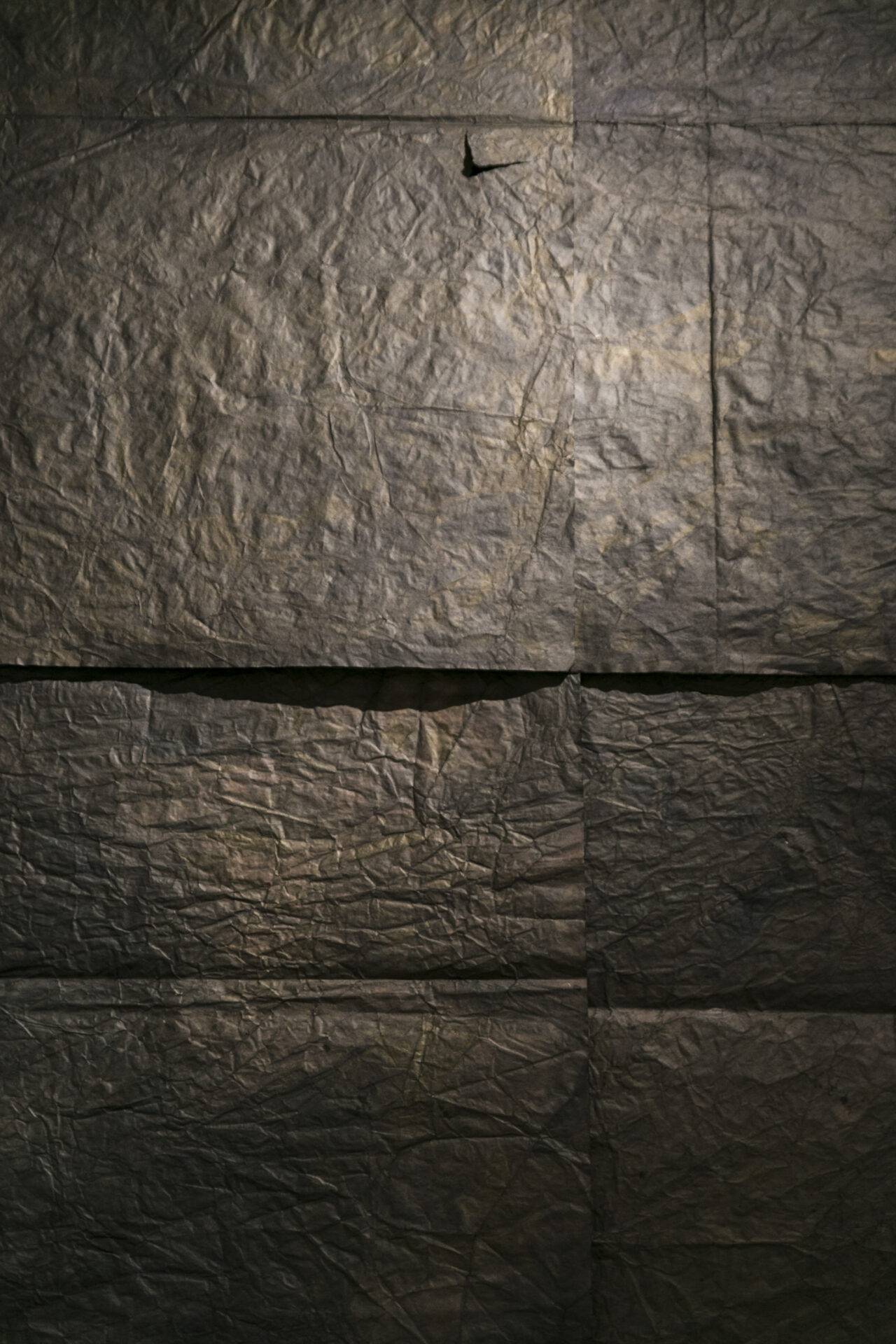 tkanina dł. ok. 10 m; POLE KWADRATU, papier barwiony ok. 2 x 2 m; RYSUNEK ODRĘCZNY, tkanina ; cykl RYSUNKÓW i SZKICOWNIK (Z CYKLU TWORZENIE FIGUR NIEMOŻLIWYCH); CODZIENNOŚĆ 164 x 215 cm, haft na barwionym papierze ryżowym