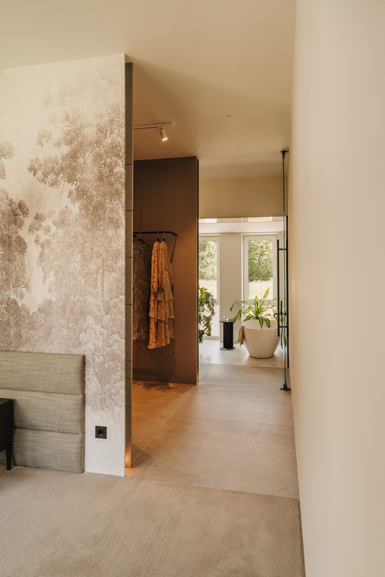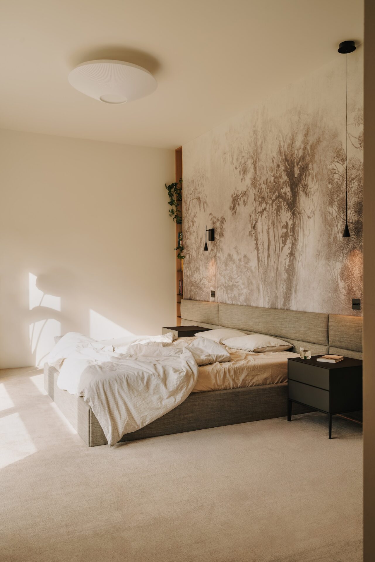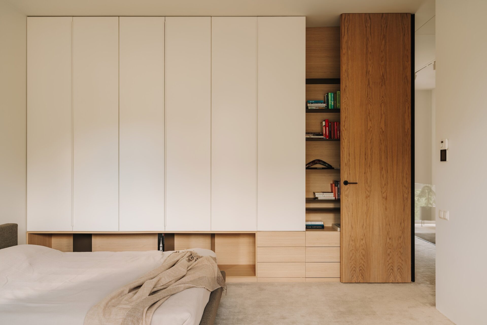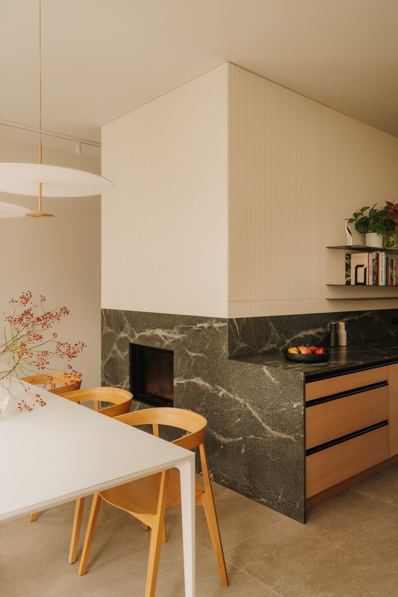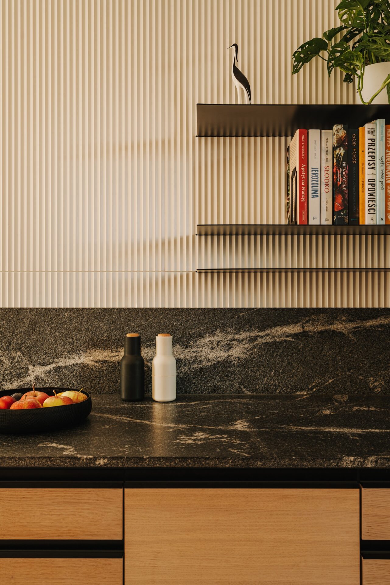 Charakter wnętrz, surowość, prostota, ograniczona paleta materiałów odzwierciedla potrzeby użytkowników oraz odnosi się do kontekstu pobliskiego jeziora Raduń. Nieregularna, wyoblona wstęga okładziny ścian hallu prowadzi nas od wejścia do kolejnych pomieszczeń apartamentu. Unifikuje zbudowane pod różnym kątem ściany, tonizując zastaną, skomplikowaną strukturę pomieszczeń. Wydziela część dzienną i nocną apartamentu.