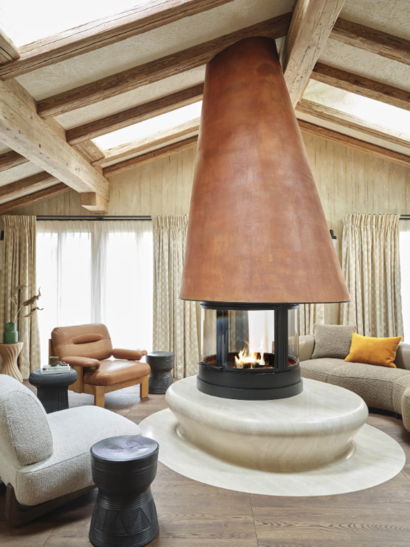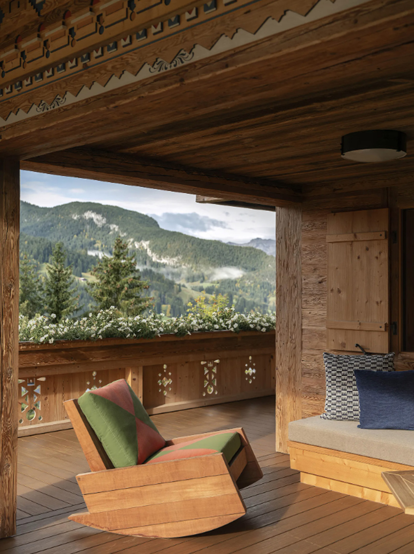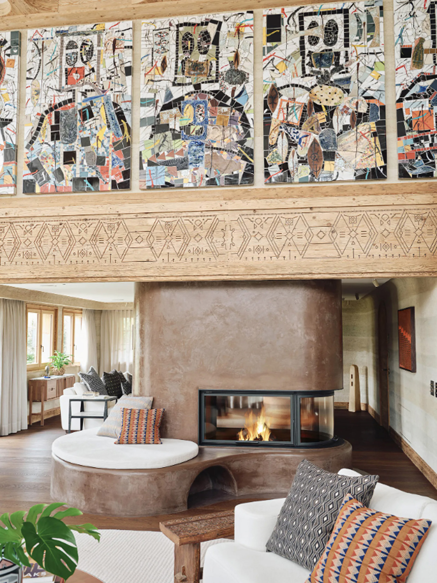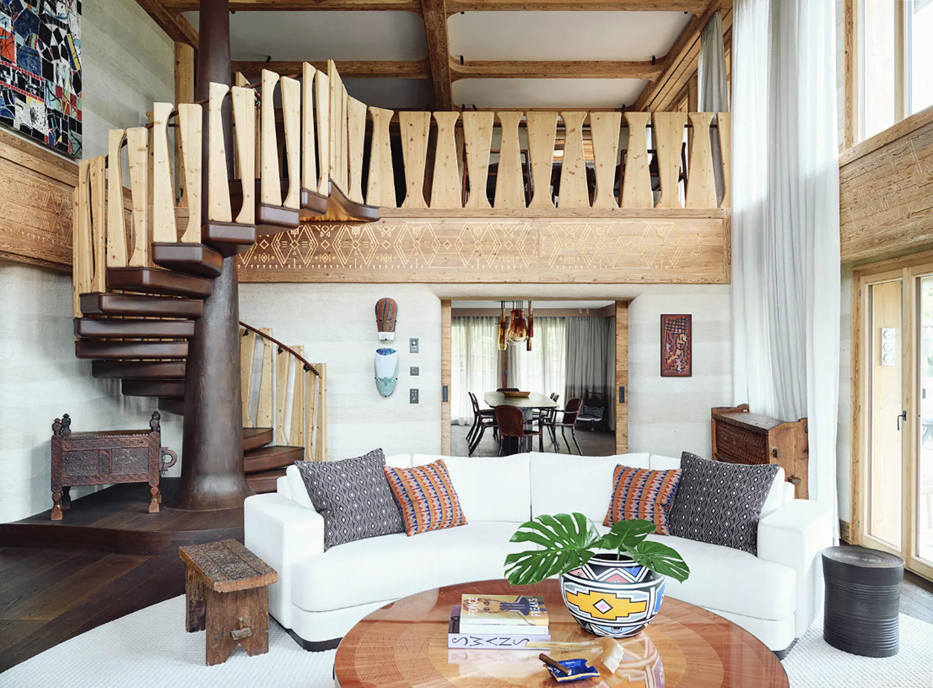 Chalet African łączy tradycje architektoniczne Alp Szwajcarskich z zachodnioafrykańską estetyką i rzemiosłem. Wnętrza zaprojektowano na zasadzie organicznego przepływu przestrzeni, tworząc poczucie zanurzenia i naturalności. Materiały – naturalne lub pochodzące z recyklingu – są wykorzystywane z dbałością o tradycyjne metodologie. Organiczne krzywiznę i tekstury pochodzące z natury nadają mieszkalnym przestrzeniom unikalne piękno, stanowiące przedłużenie krajobrazu. Projekt konfrontuje perspektywę eurocentryczną, celebrując współpracę artystów i projektantów z Afryki i całego świata.