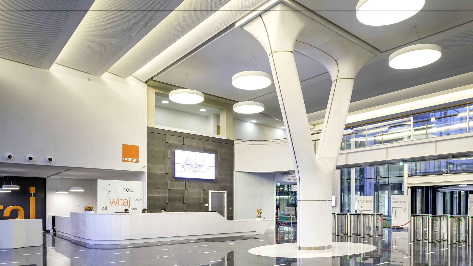Siedziba główna Orange S.A. to zespół pięciu sześciokondygnacyjnych budynków tworzących „Miasteczko Orange”. Wnętrza wyróżnia imponujący centralny filar w holu wejściowym, obłożony białym marmurem, który nadaje wnętrzu elegancję i charakter. Przestrzeń biurowa zaprojektowano z naciskiem na optymalne doświetlenie naturalnym światłem, z inteligentnym sterowaniem oświetleniem elektrycznym. Zieleń wewnętrznego ogrodu przedłuża odczucie przestrzeni, tworząc harmonijne i komfortowe środowisko pracy. Architekturę wnętrz cechuje dbałość o funkcjonalność i estetykę w zgodzie z zasadami ekologii.